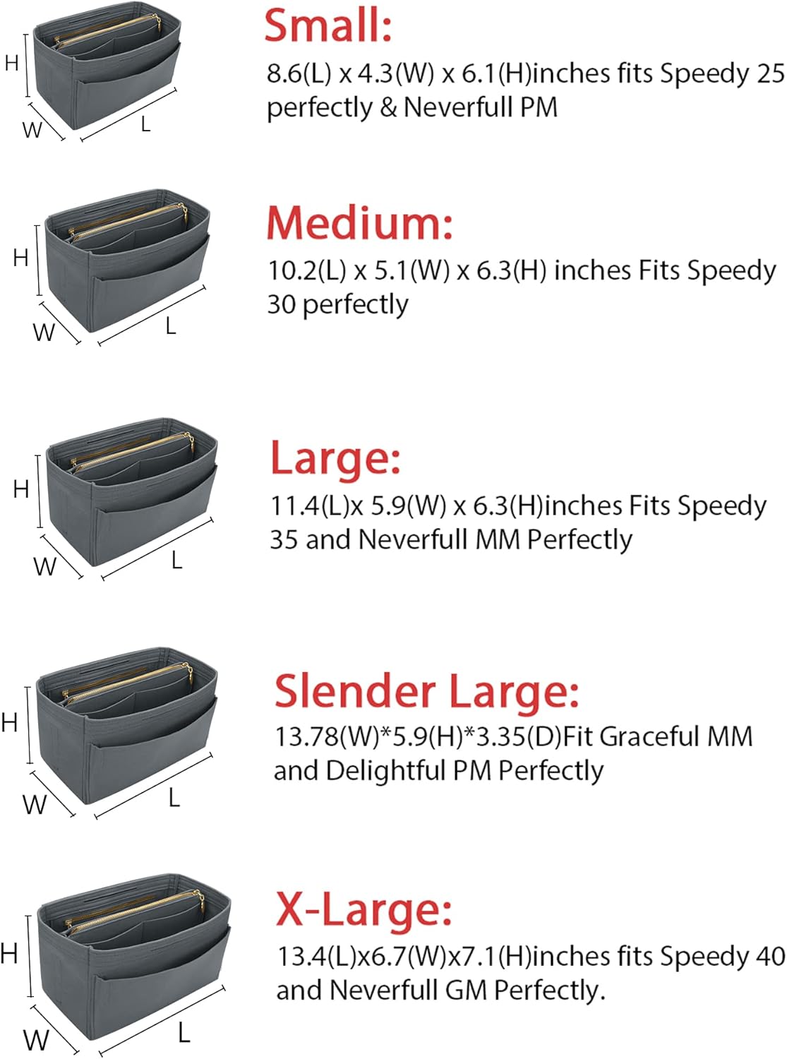 - SIZE OF BAG ORGANIZER: Medium: 9.25(L)*5.9(H)*5.1(W) inch Fits Speedy 30 Perfectly. Slender Medium: 11.2(L)*6.5(H)*3.2(W)inch Fits Graceful PM. Large: 11.4(L)*7.1(H) *5.9(W)inch Fits Speedy 35 and Neverfull MM Perfectly. Slender Large: 13.78(L)*5.9(H)*3.35(W)Fit Graceful MM and Delightful PM Perfectly. X-Large:13.4(L)*7.1(H)*6.7(W)inch fits Speedy 40 and Neverfull GM Perfectly. Portable and Compact Purse Perfectly For any Brand.L*H*W means (Length*Height*Width)