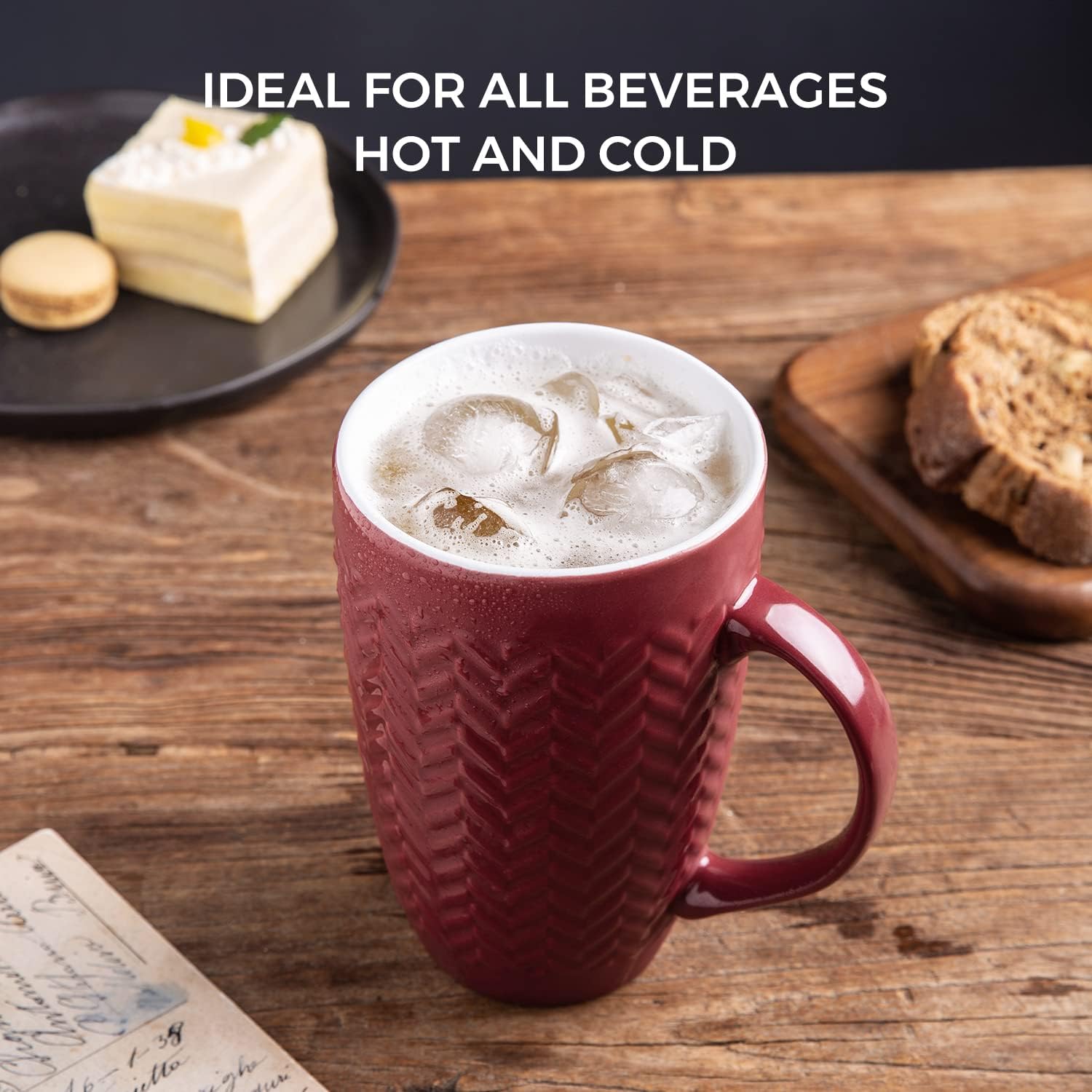AmorArc Large Coffee Mugs Set of 6, 20oz Ceramic Tall Coffee Mugs Set with Textured Geometric Patterns for Coffee/Tea/Beer/Hot Cocoa, Dishwasher & Microwave Safe, Beige&Burgundy