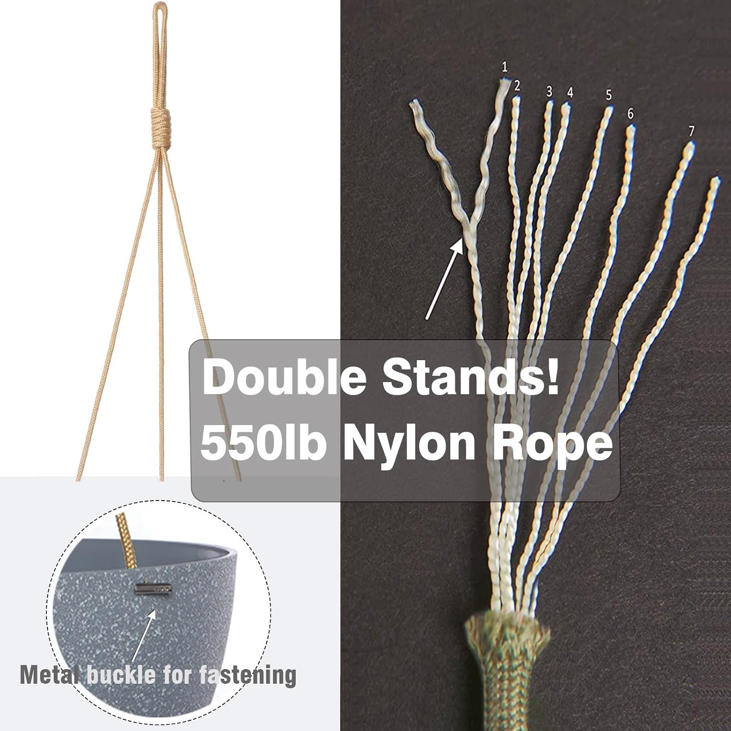 - [Adjustable Hanging Rope] Crafted from durable plastic with adjustable high-strength nylon rope, the pots are lightweight yet sturdy for easy transport. The hanging rope is made of sturdy nylon rope with excellent elasticity, you can freely adjust the height you want, the full nylon construction provides abrasion resistance, it can easily hang plants weighing up to 20 pounds without taking up any floor space, and take your plants to new heights.