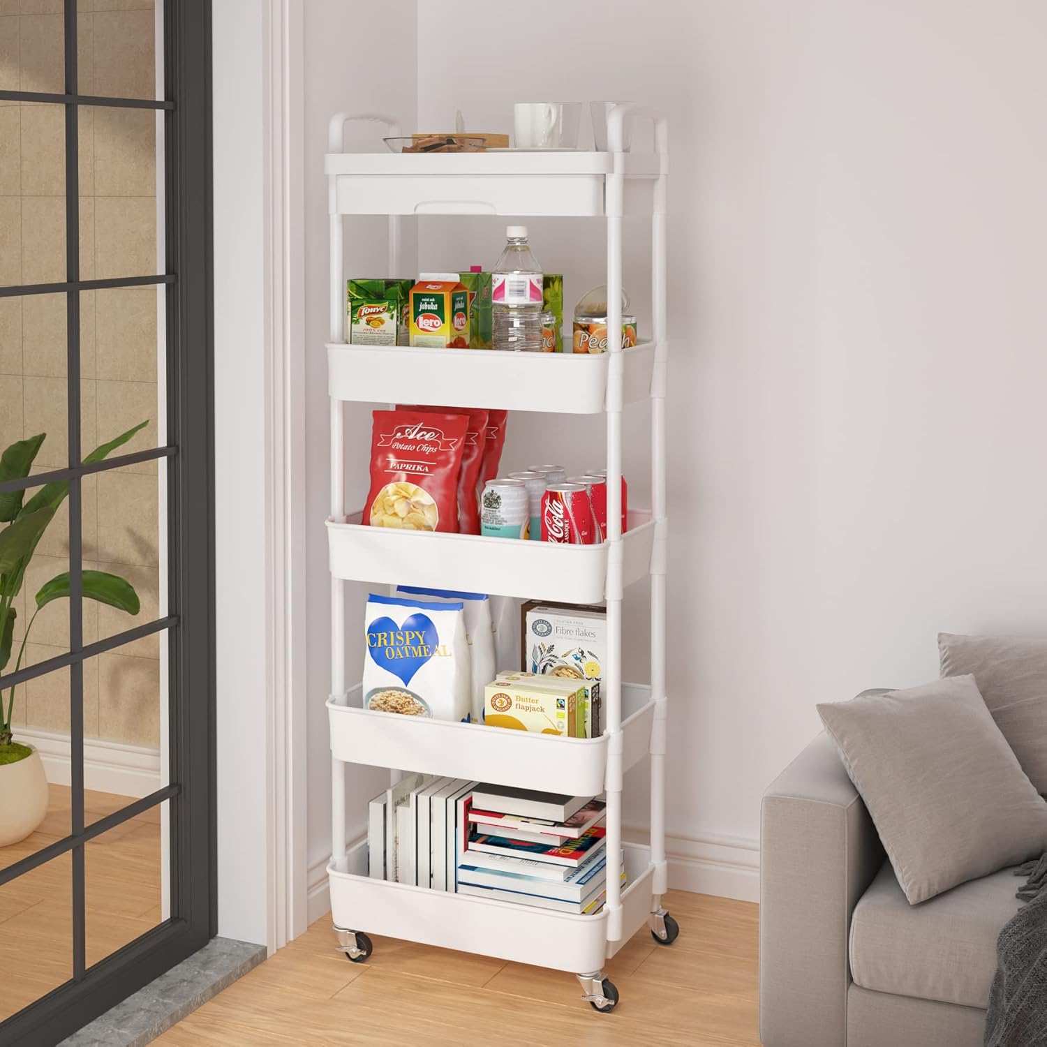 Calmootey 5-Tier Rolling Utility Cart with Drawer,Multifunctional Storage Organizer with Plastic Shelf & Metal Wheels,Storage Cart for Kitchen,Bathroom,Living Room,Office,White