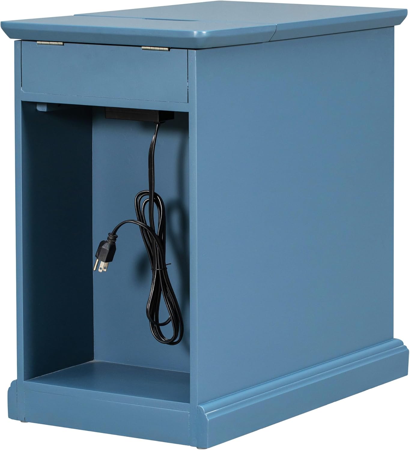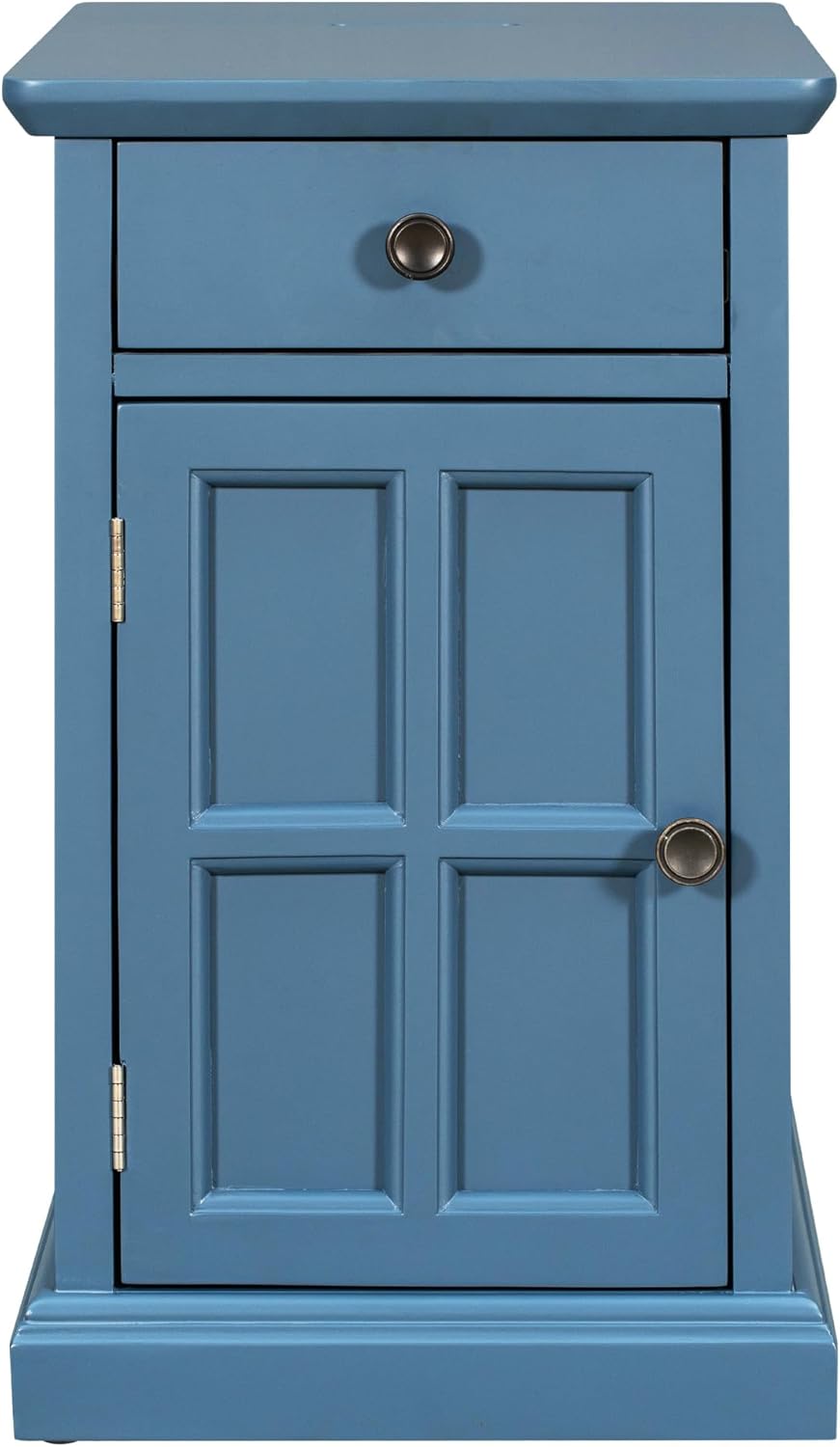 Traditional Wood End Table with Charging Station, Modern Vintage Sofa Chair Side Table Nightstand with Storage & Drawer for Living Room Bedroom, No Assembly, Antique Navy