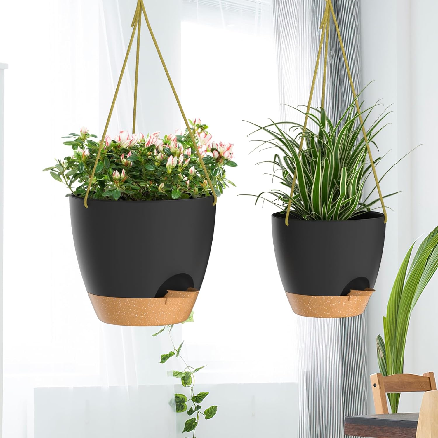 ZMTECH 8 Inch Hanging Planters for Indoor Outdoor Plants, 2 Pack Self Watering Hanging Plant Pots with Drainage Holes and Removable Saucer, Plastic Flower Hanging Pots with Watering Lip (Black)
