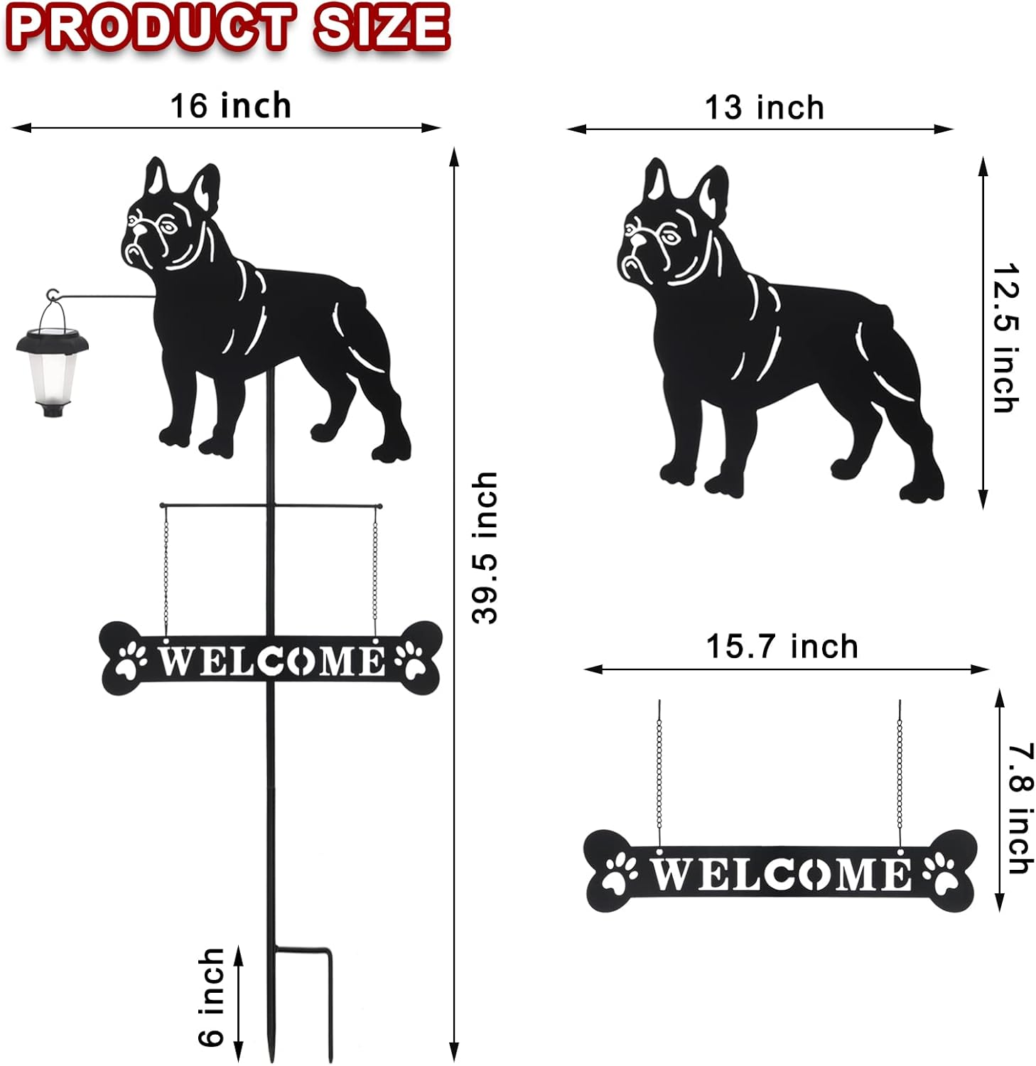 - French Bulldog Welcome Sign: This 39.5’’ adorable metal stake features the silhouette of a friendly french bulldog holding a lantern. A bone-shaped “WELCOME” sign with two dog paw prints will bring a smile to everyone who visits your home. Enhance your home or garden with your favourite breed.