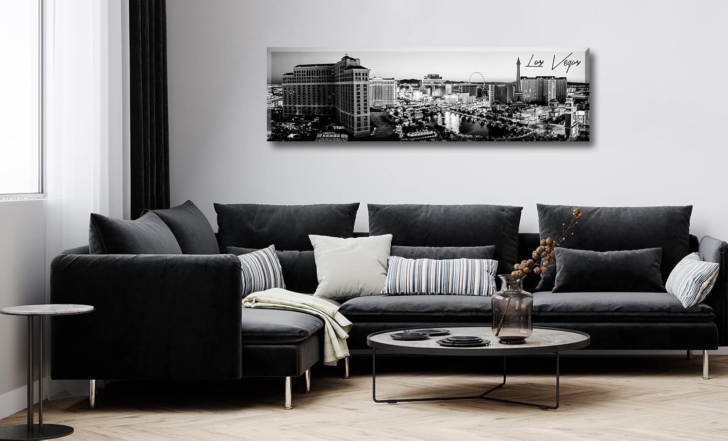 Las Vegas Skyline Wall Art for Living Room American Cityscape Canvas Prints Black and White City Bellagio Fountain Skyscraper Night View Panoramic Pictures Modern Building Poster Framed 13.8"X47.3"