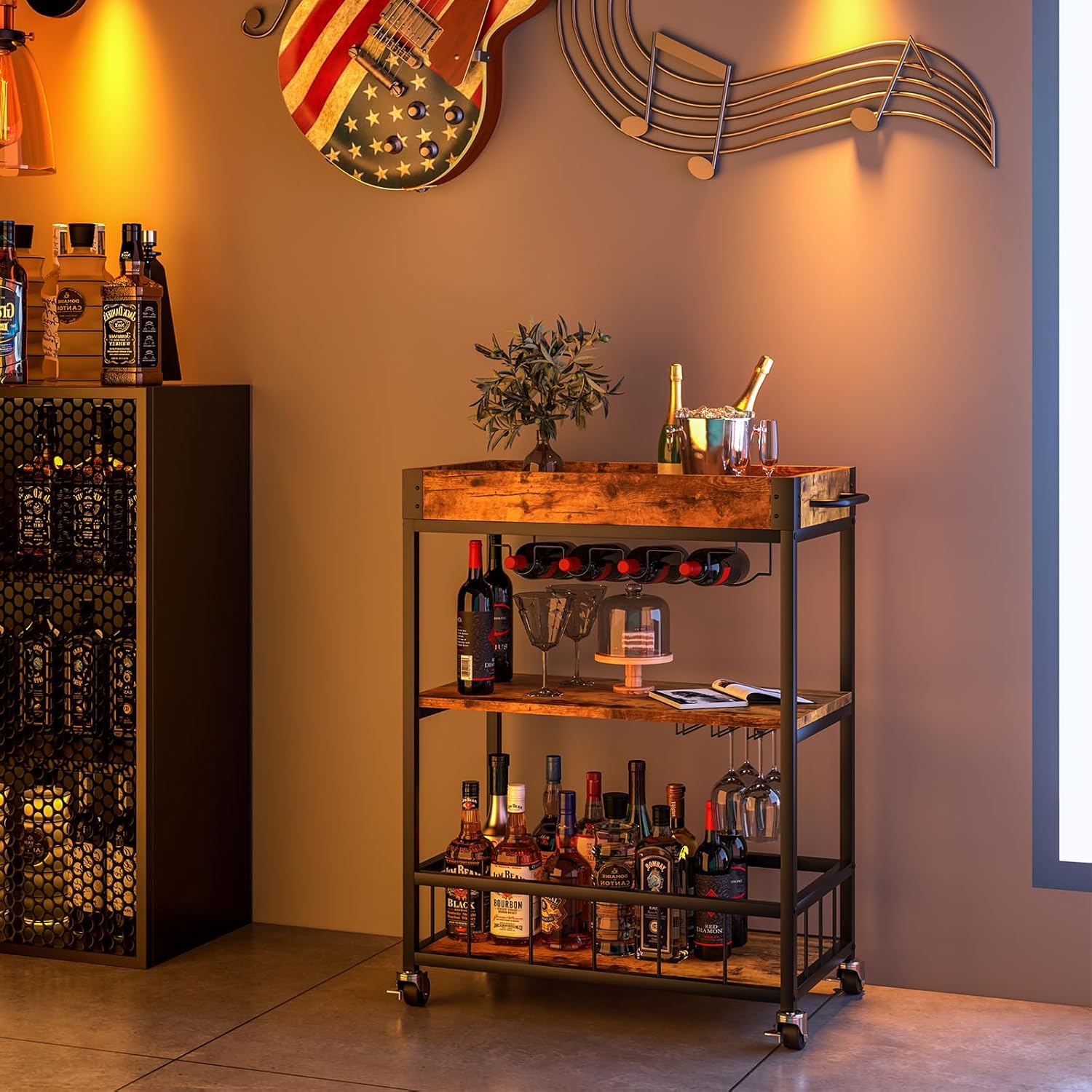 Bar Cart Serving Wine 3 Tier Home Rolling Rack with Wheels Mobile Kitchen Industrial Vintage Style Wood Metal Serving Trolley Serving Cart,Glass Holder Bar Cabinet