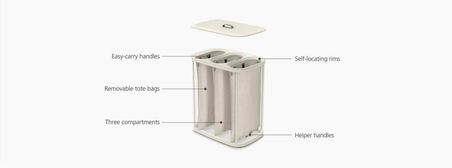 Joseph Joseph Tota Trio 90 liter/23.8 gallon Laundry Hamper Separation Basket with lid, 3 Removable Washing Bags with Handles- Ecru