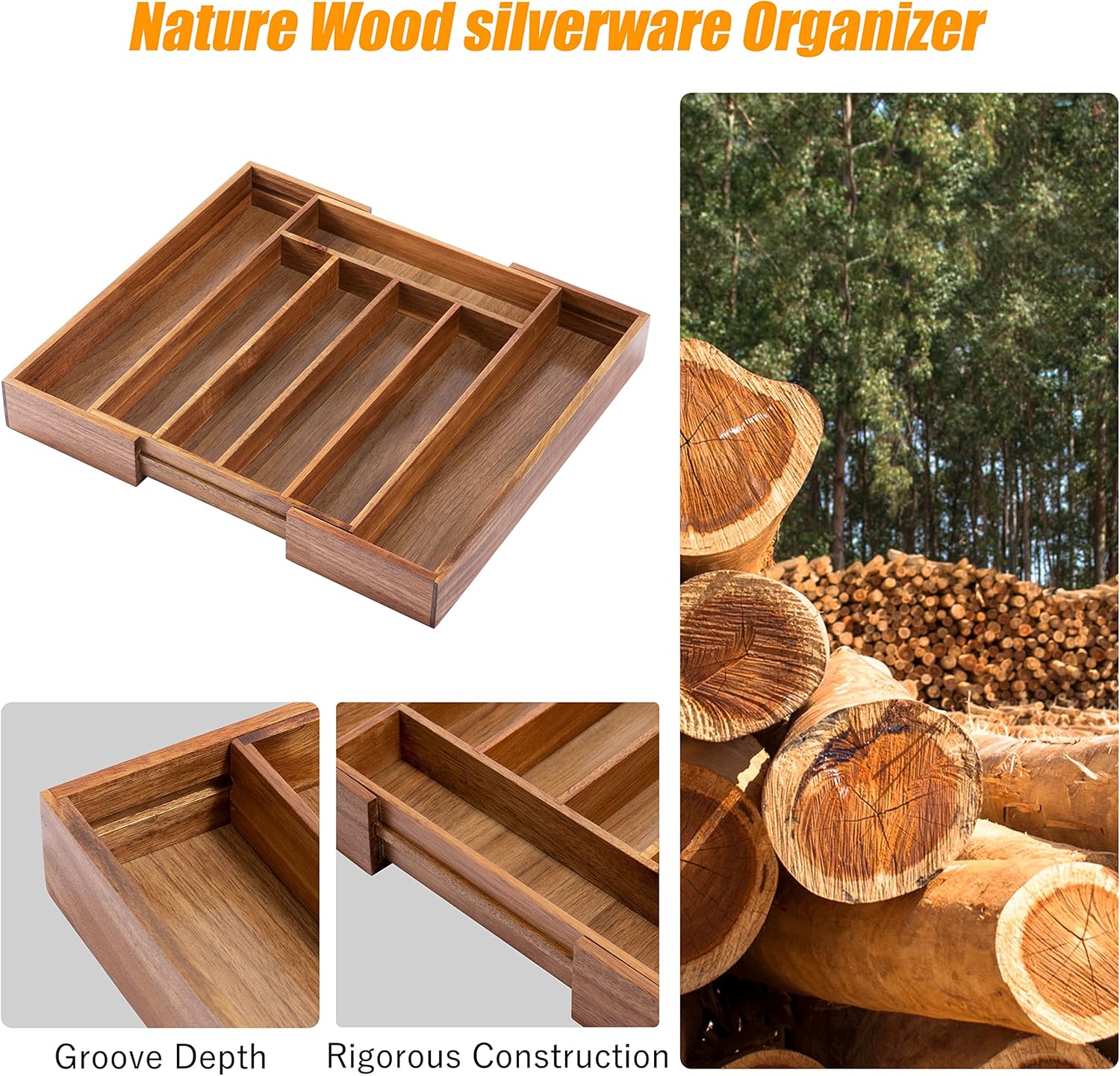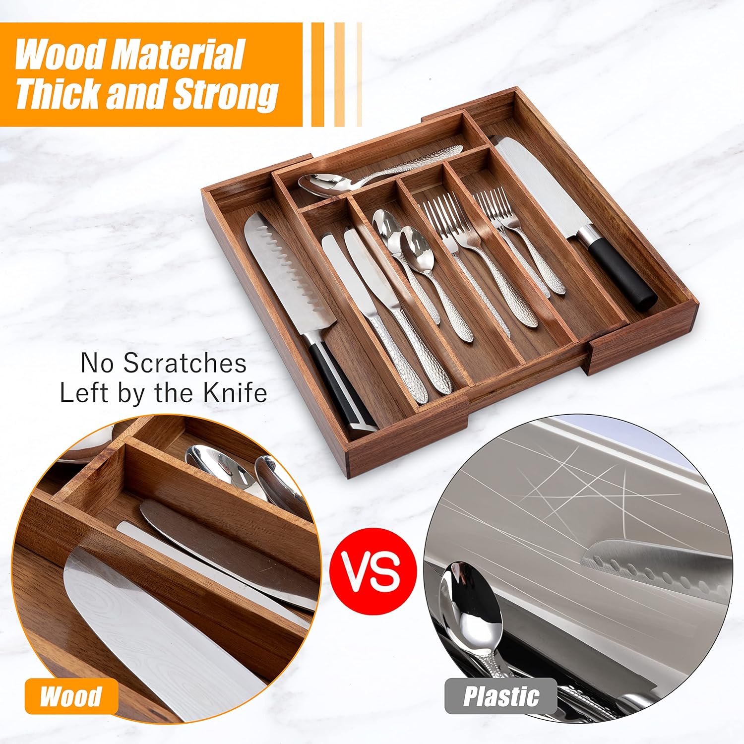 - β γFit your drawer perfectlyγStill measuring every kitchen drawer and buying a kitchen drawer organizer of the same size? Our bamboo silverware drawer organizer is designed with 5-7 compartments. Thanks to its adjustable features, our expandable drawer organizer can be expanded from 10 to 15 inch wide, Perfect for any kitchen drawers.