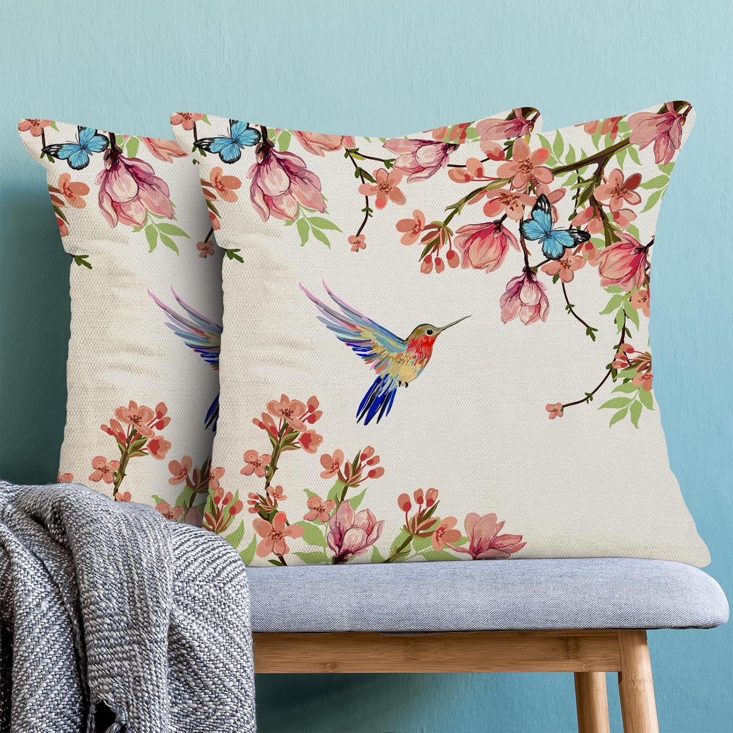 Hummingbird Flower Pillow Covers 20 x 20 Inch Set of 2 for Watercolor Floral and Birds Spring Blooming Decor Throw Pillows Nature Plant Outdoor Decorative Cushion Cases for Couch Bed Decoration