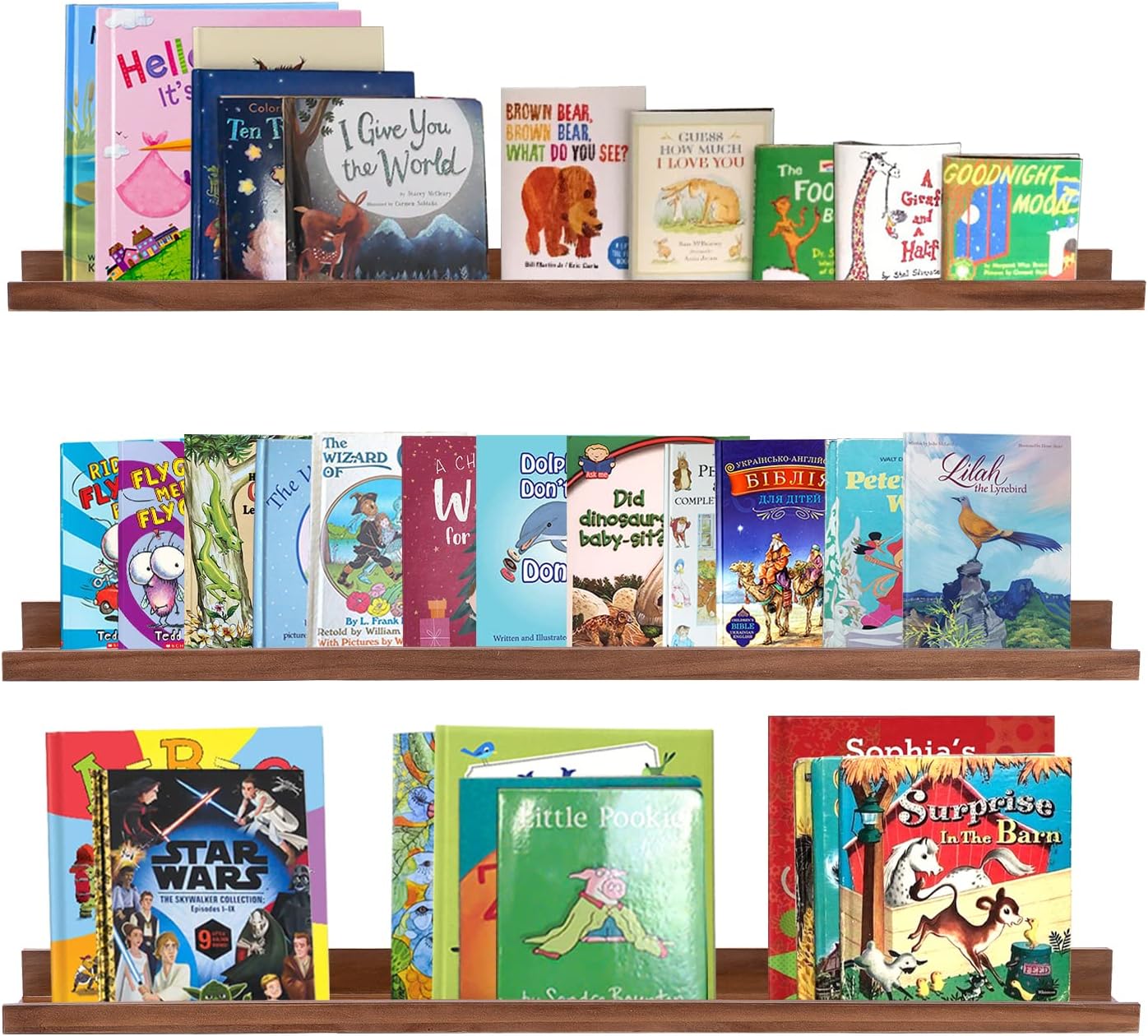 AZSKY 36 Inch Floating Book Shelves Rustic Wood Wall Picture Ledge Shelf for Storage Light Walnut Wall Mounted Picture Photo Display Shelf a Set of 3 Hanging Book Shelf