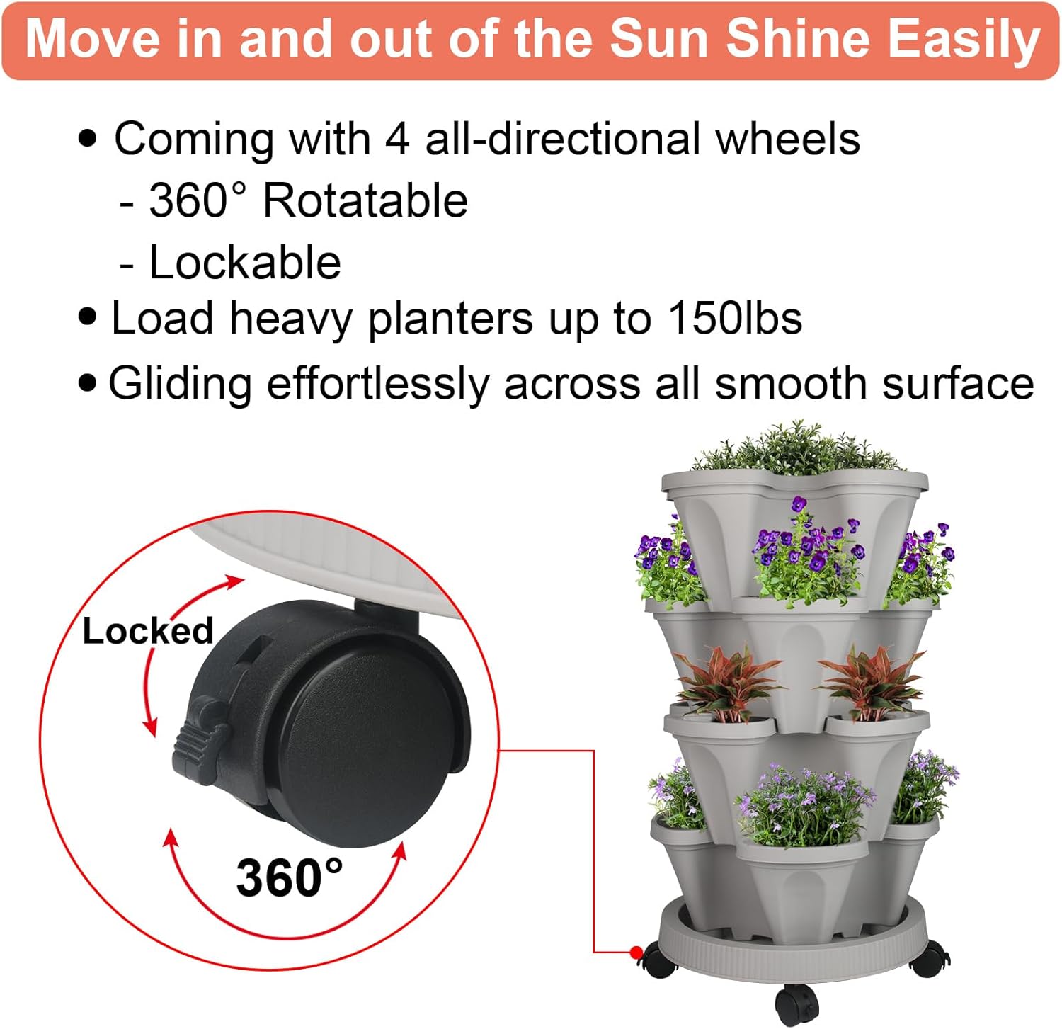 Vertical Planter 4 Tier Stackable Planters Garden Planters Strawberry Herb Flower and Vegetable Planter Indoor Outdoor Gardening Pots with Removable Wheels and Tools