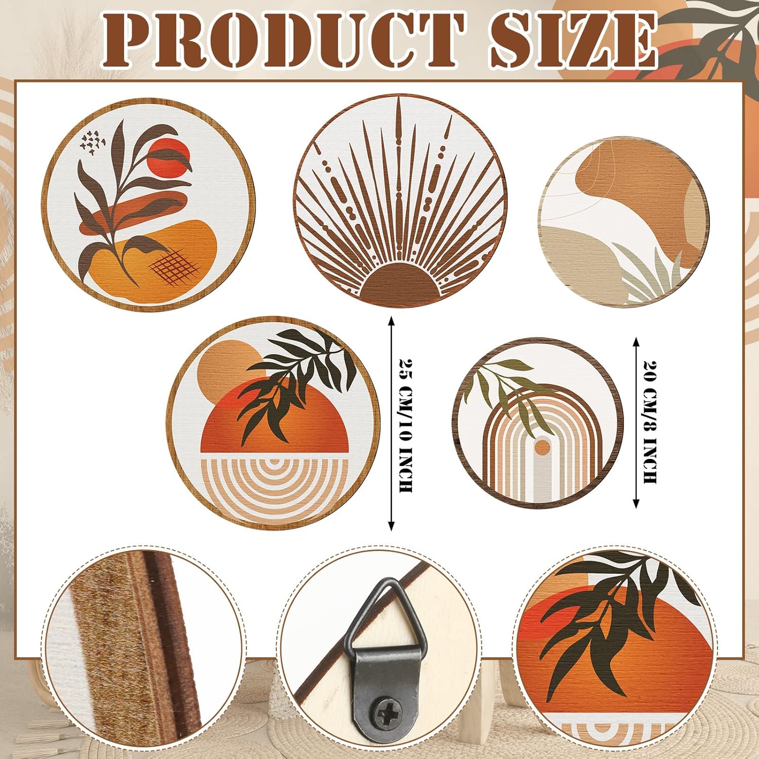 - Proper Size for Display: there are 2 kinds of sizes of the aesthetic wall art, 3 bigger ones measure about 10 inches/ 25 cm in diameter, and 2 smaller ones are about 8 inches/ 20 cm in diameter, all of them are about 0.2 inch/ 0.5 cm in thickness, proper size to catch people's attention