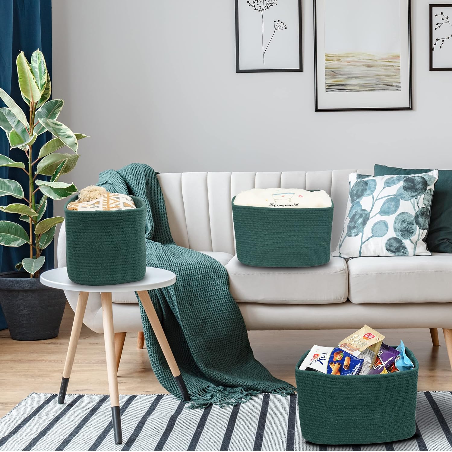 Cotton Rope storage Basket Bins14.5X9.5X9.3“ Basket for Organizing Shelves Rectangle Decorative Baskets For storage Clothes Toys Books Towels Square Wicker Nursery basket organizer 3 pack Dark green