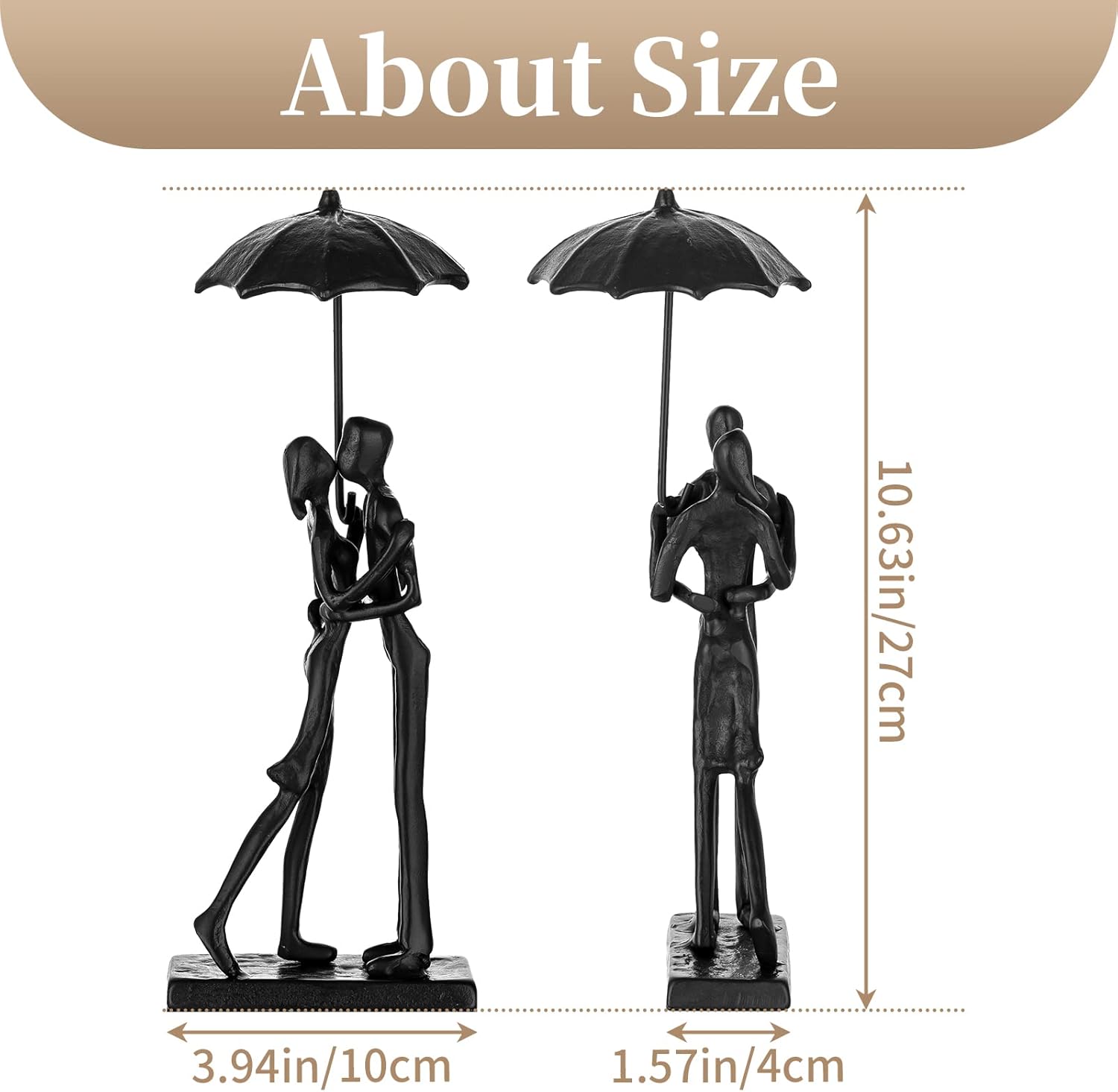 - KISSING COUPLE FIGURINES - This contemporary sculpture captures the sweet moment of the couple kissing under the umbrella, the black finish makes it like a silhouette look, adds a romantic flare for industrial and farmhouse style. Could match the most decorative ideas.