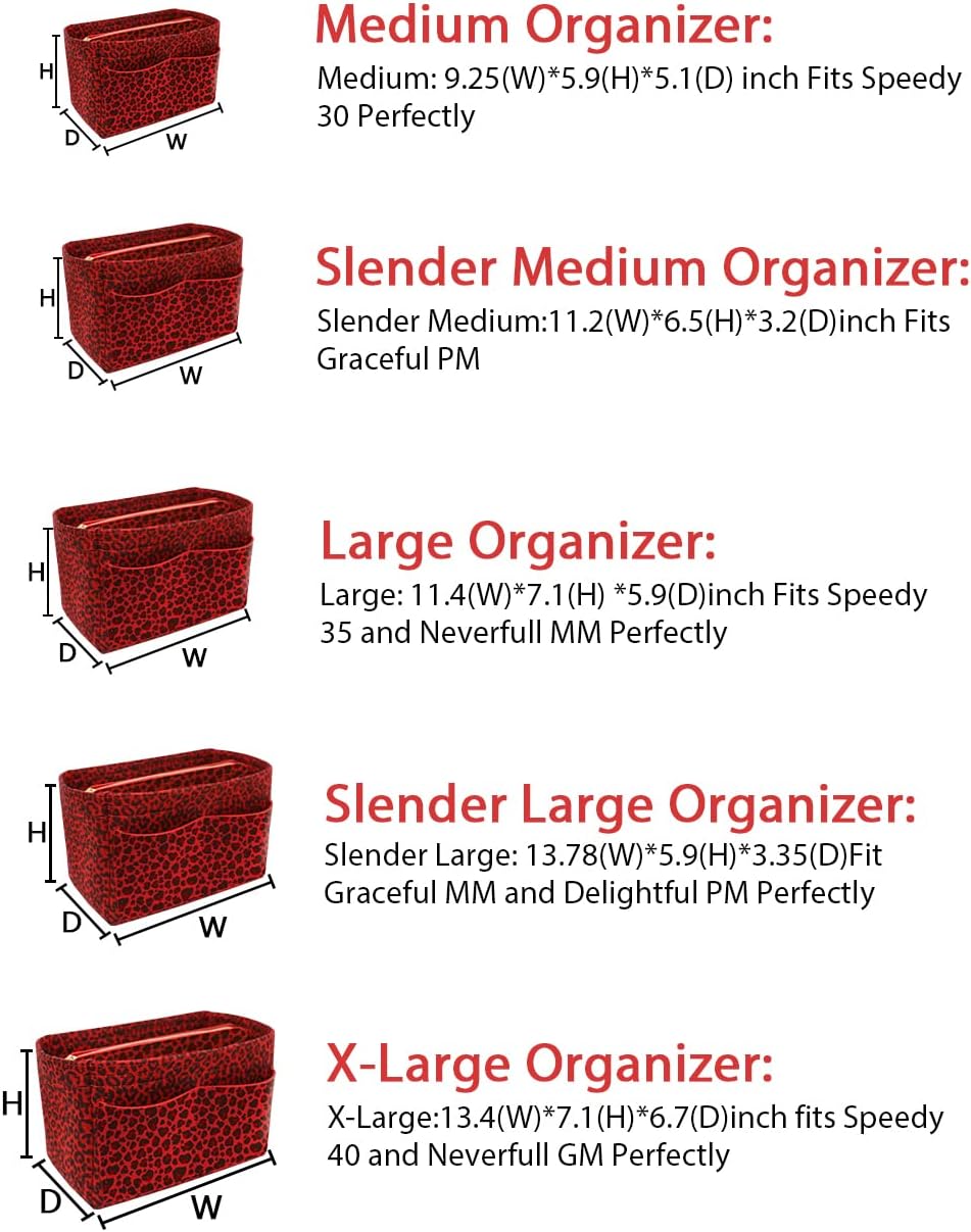 • SIZE OF BAG ORGANIZER: Medium: 9.25(L)*5.9(H)*5.1(W) inch Fits Speedy 30 Perfectly. Slender Medium: 11.2(L)*6.5(H)*3.2(W)inch Fits Graceful PM. Large: 11.4(L)*7.1(H) *5.9(W)inch Fits Speedy 35 and Neverfull MM Perfectly. Slender Large: 13.78(L)*5.9(H)*3.35(W)Fit Graceful MM and Delightful PM Perfectly. X-Large:13.4(L)*7.1(H)*6.7(W)inch fits Speedy 40 and Neverfull GM Perfectly. Portable and Compact Purse Perfectly For any Brand.L*H*W means (Length*Height*Width)