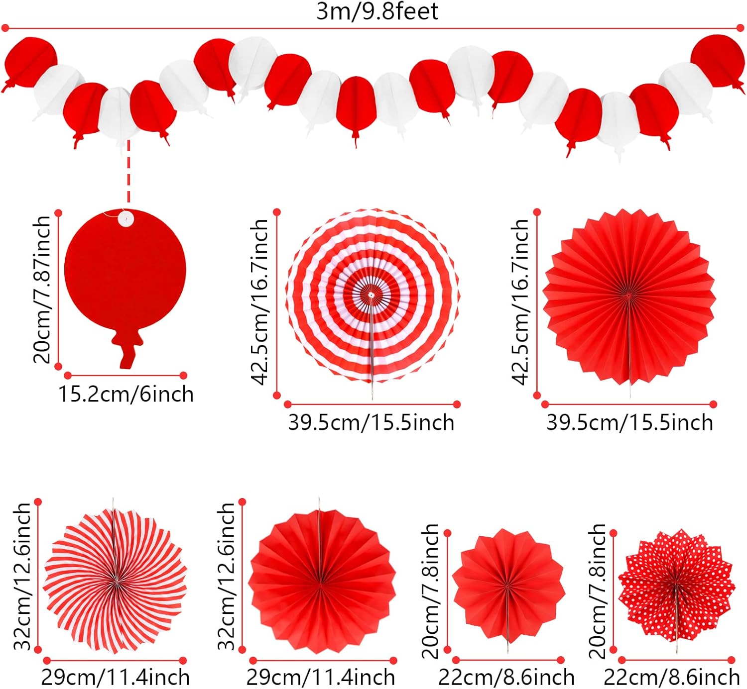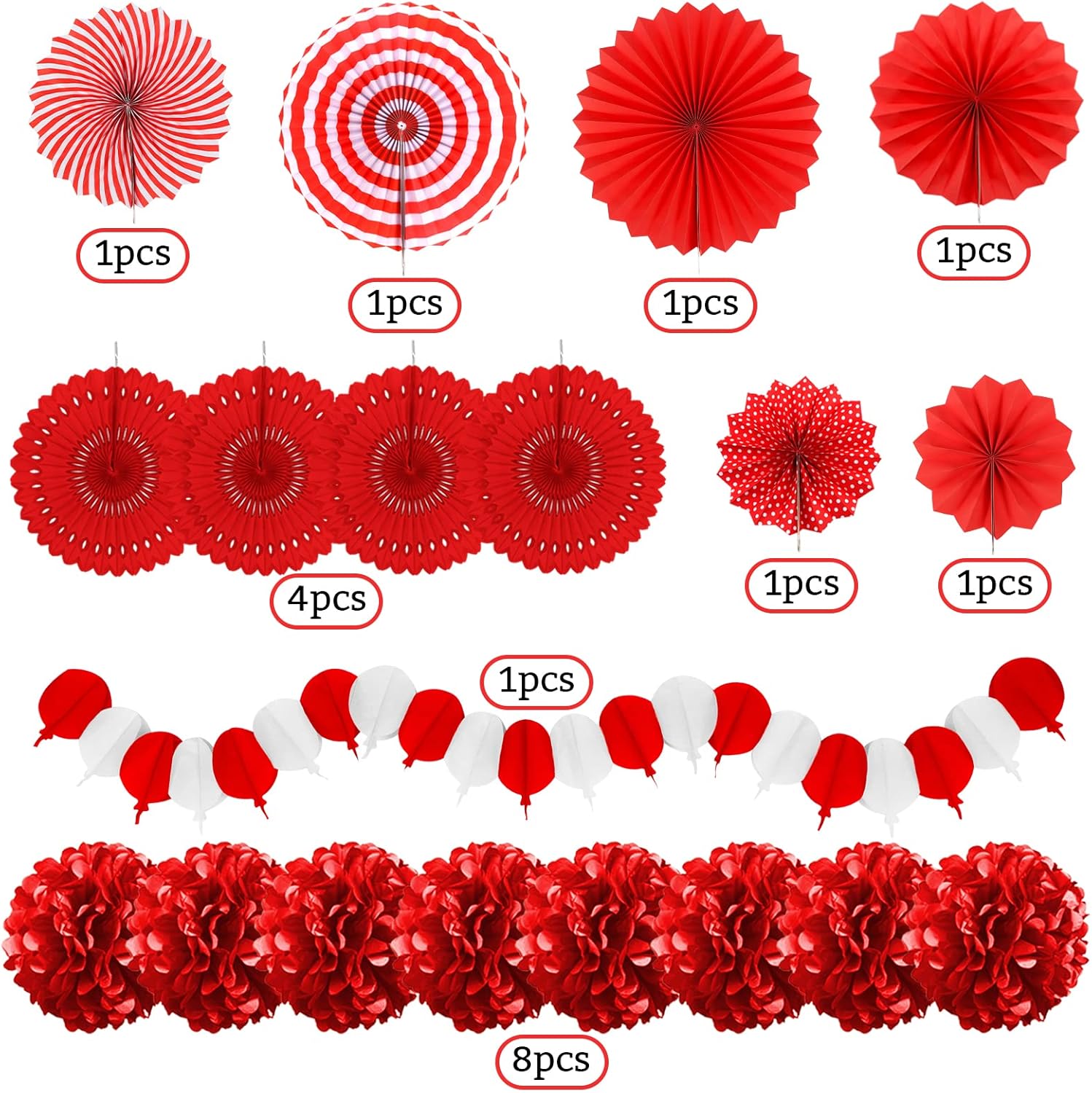 - 【What you will get】6 x paper fans, 8 x paper pompoms, 4 x paper hollow fans, 1 x paper hot air balloon garland (Color: Red)