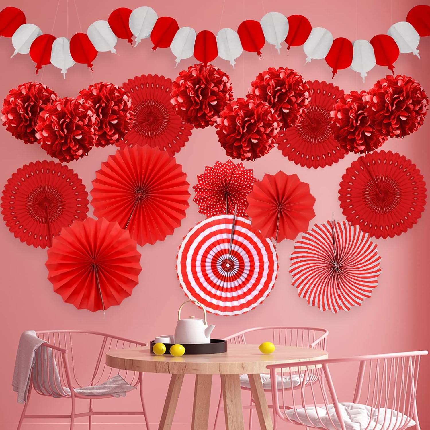 Red Party Decorations, Papar Fans Pompoms Fans Garlands for Birthday Bridal Baby Shower Wedding Graduation New Years Valentine's Day Party Decorations