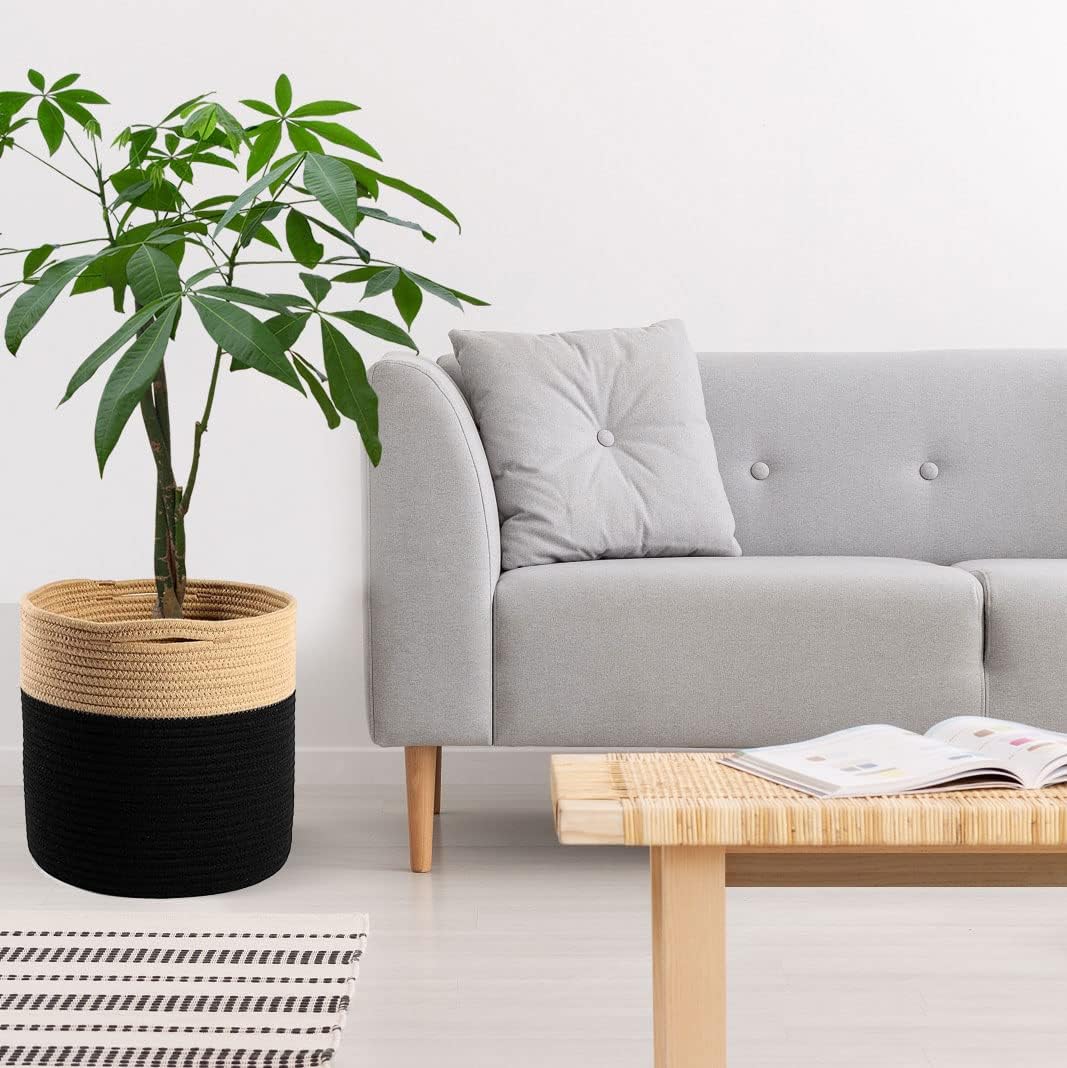 Woven Cotton Rope Plant Basket for 10" Flower Pot Floor Indoor Planters Flower Pot, Home Decor Storage Organizer H11 x W11 Black&Brown