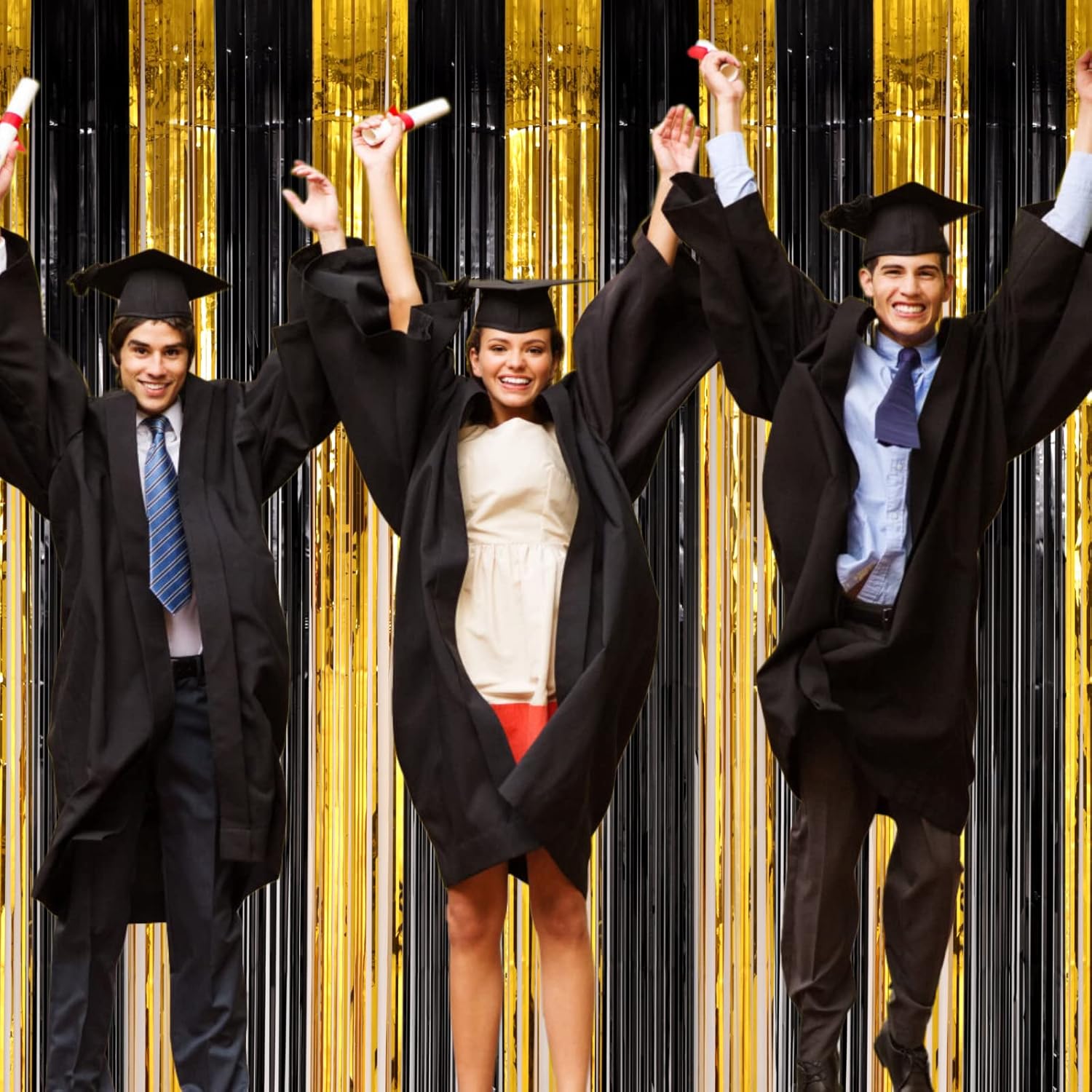 3 Pack 3.3x8.2 Feet Black and Gold Foil Fringe Backdrop Curtains, Tinsel Streamers Birthday Party Decorations, Fringe Backdrop for Graduation, Baby Shower, Gender Reveal, Disco Party