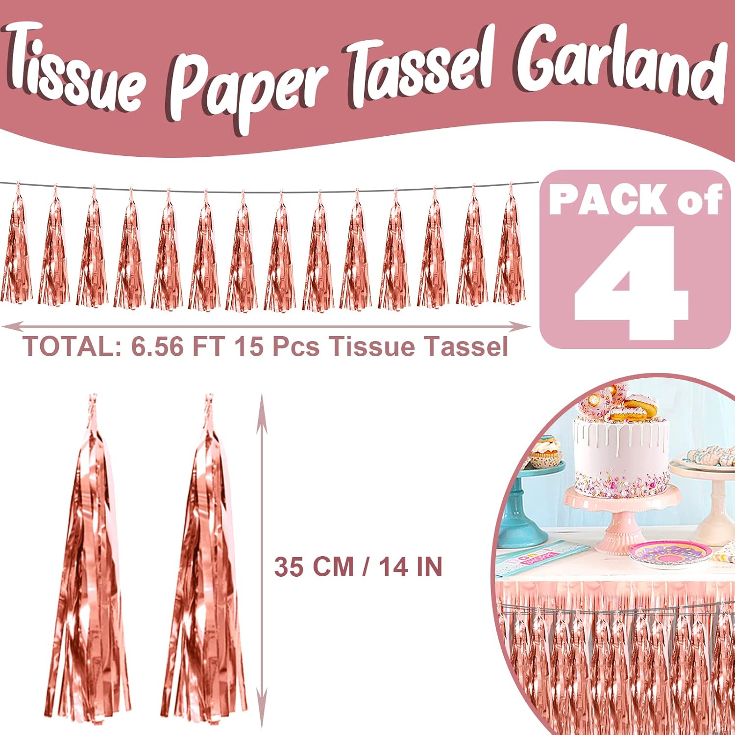 - 【Rose Gold Party Supplies Set】: The total length of the rose gold birthday tassels banner is 26.2 feet, divided into 4 strips, each 6.5 feet long. Each banner contains 15 tassels, and each tassel measures 14 inches, for birthday decorations many occasions, and so on