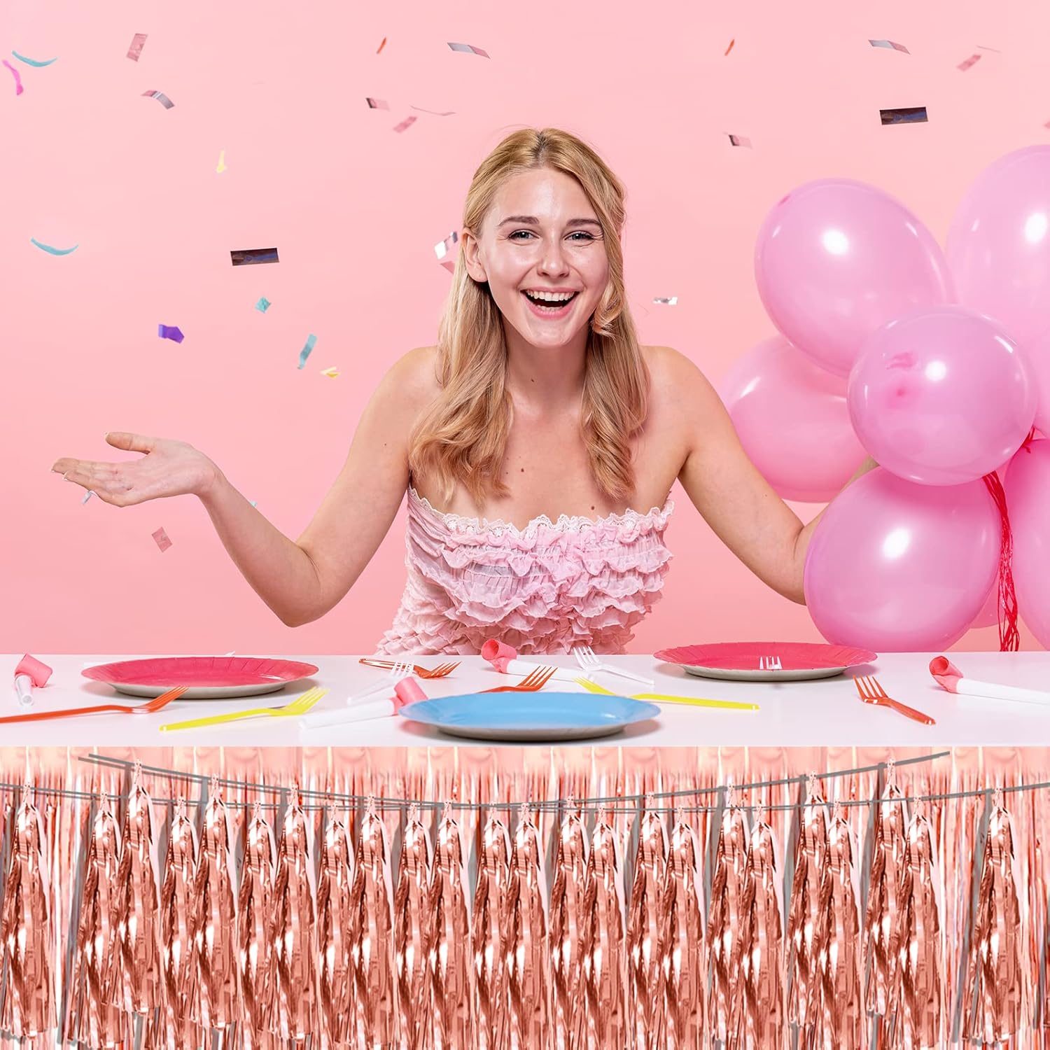 4P Rose Gold Foil Fringe Metallic Tassel Streamers Banner Tassel Garland for Parade Floats, Bachelorette, Wedding, Birthday, Halloween, Christmas, Bridal/Baby Shower Party Decorations