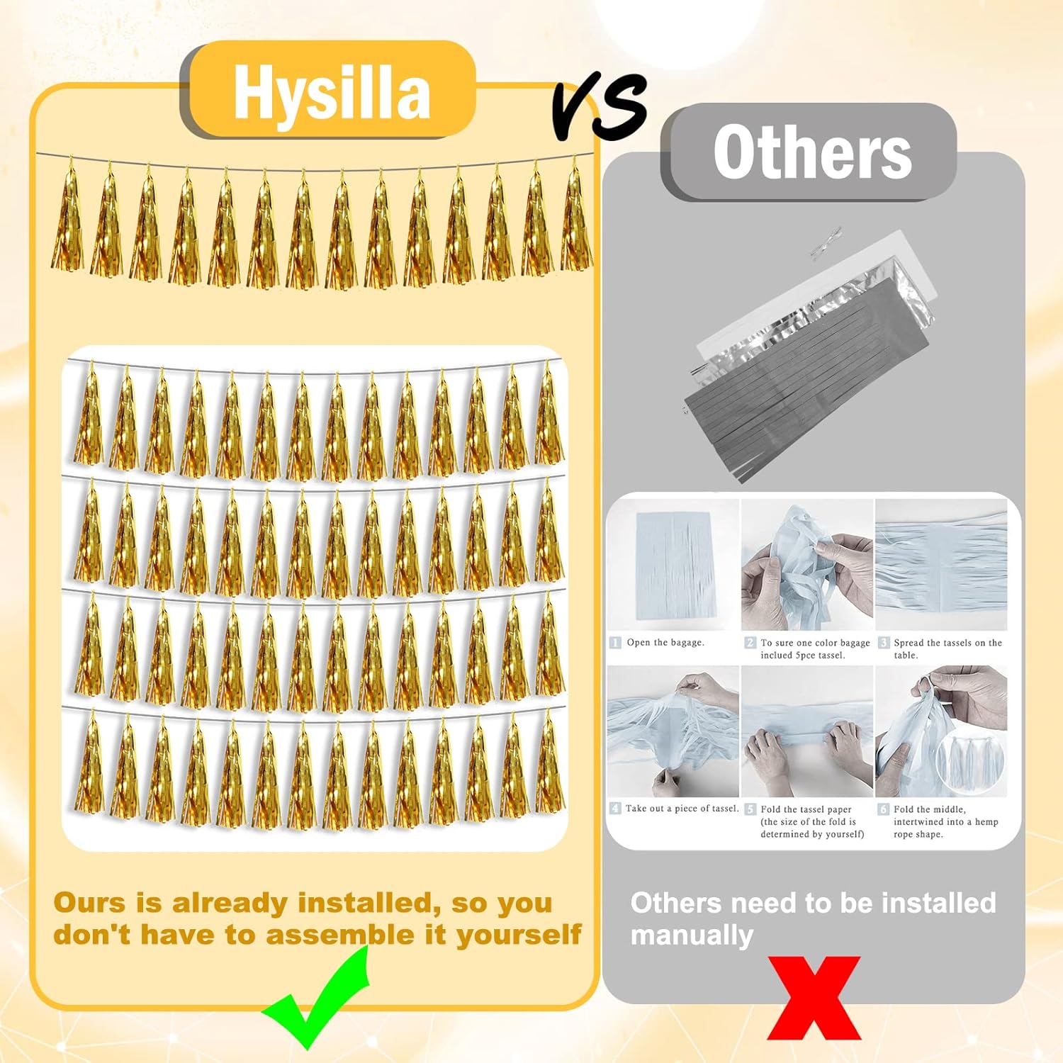 - 【Reusable Tassel Garland Material】: high-quality metallic foil tassel garlands, with the virtue of nice craftsmanship and lightweight, they are reusable and safe, and not easy to fade; They come with white ribbon for hanging, and garland tassels hang perpendicular to the string, and are adjustable to provide you with the option of spreading the tassels out or piecing them closer together.