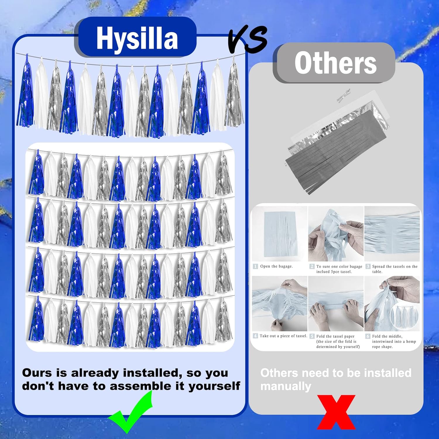 - 【Perfect Party Decoration】The navy blue white silver tinsel garlands are designed in a metallic Fringe, bright, and beautiful, at the same time, they shine in the sun, and these gorgeous tassel garlands create a wonderful backdrop or centerpiece for your party space. and bring you, your family, and your friend's good Visual effects. your party many emotional and touching moments where a lot of pictures will be taken and everybody will have a wonderful time together.
