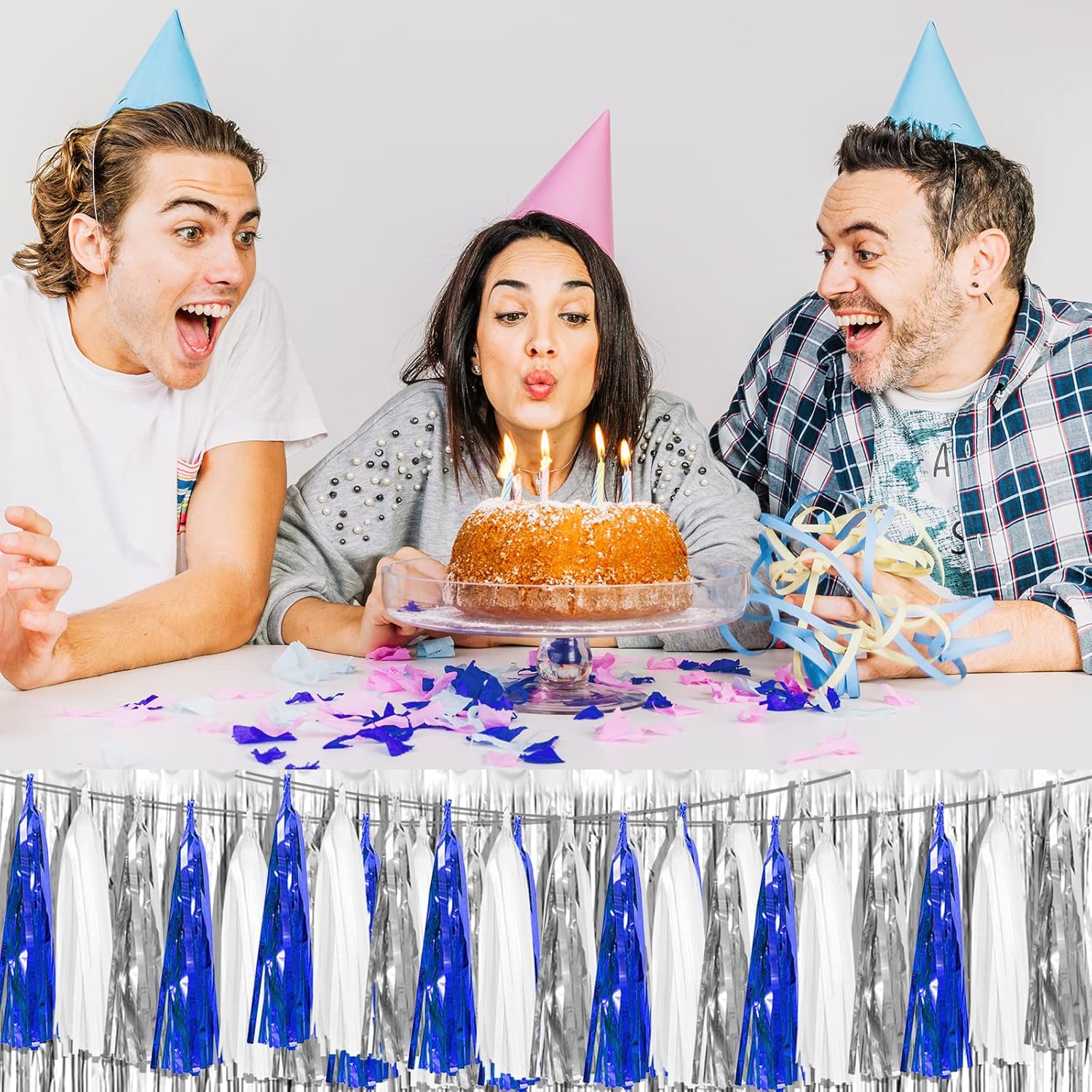 - 【Navy Blue White Silver Party Supplies Set】: The total length of the navy blue white silver birthday tassels banner is 39.3 feet, divided into 4 strips, each 9.8 feet long. Each banner contains 15 tassels, and each tassel measures 14 inches, for birthday decorations many occasions, and so on