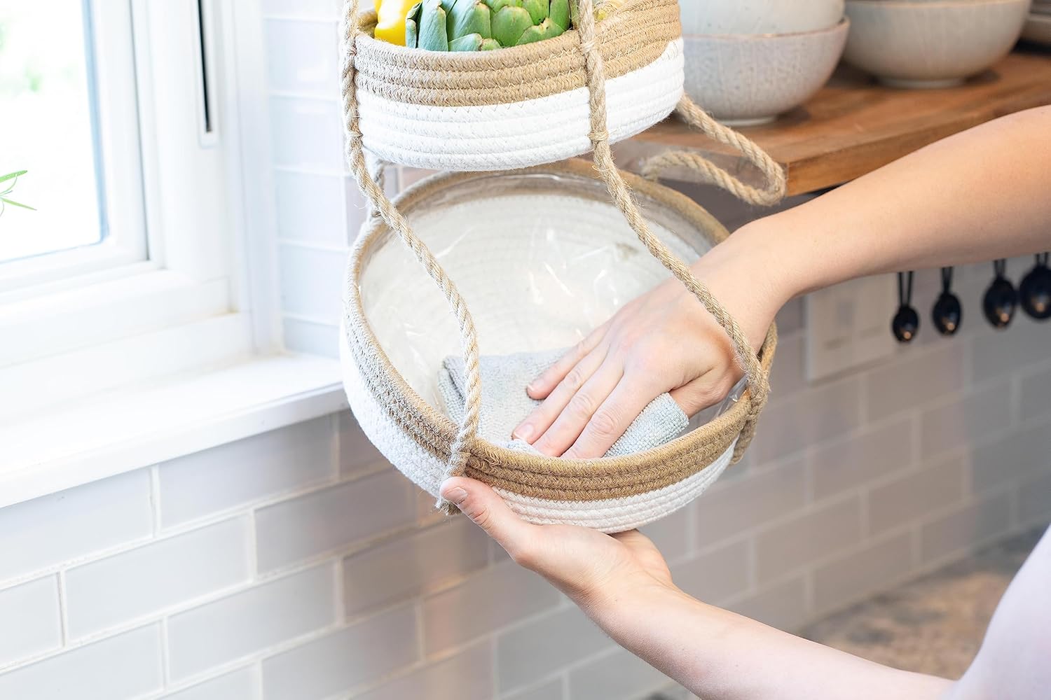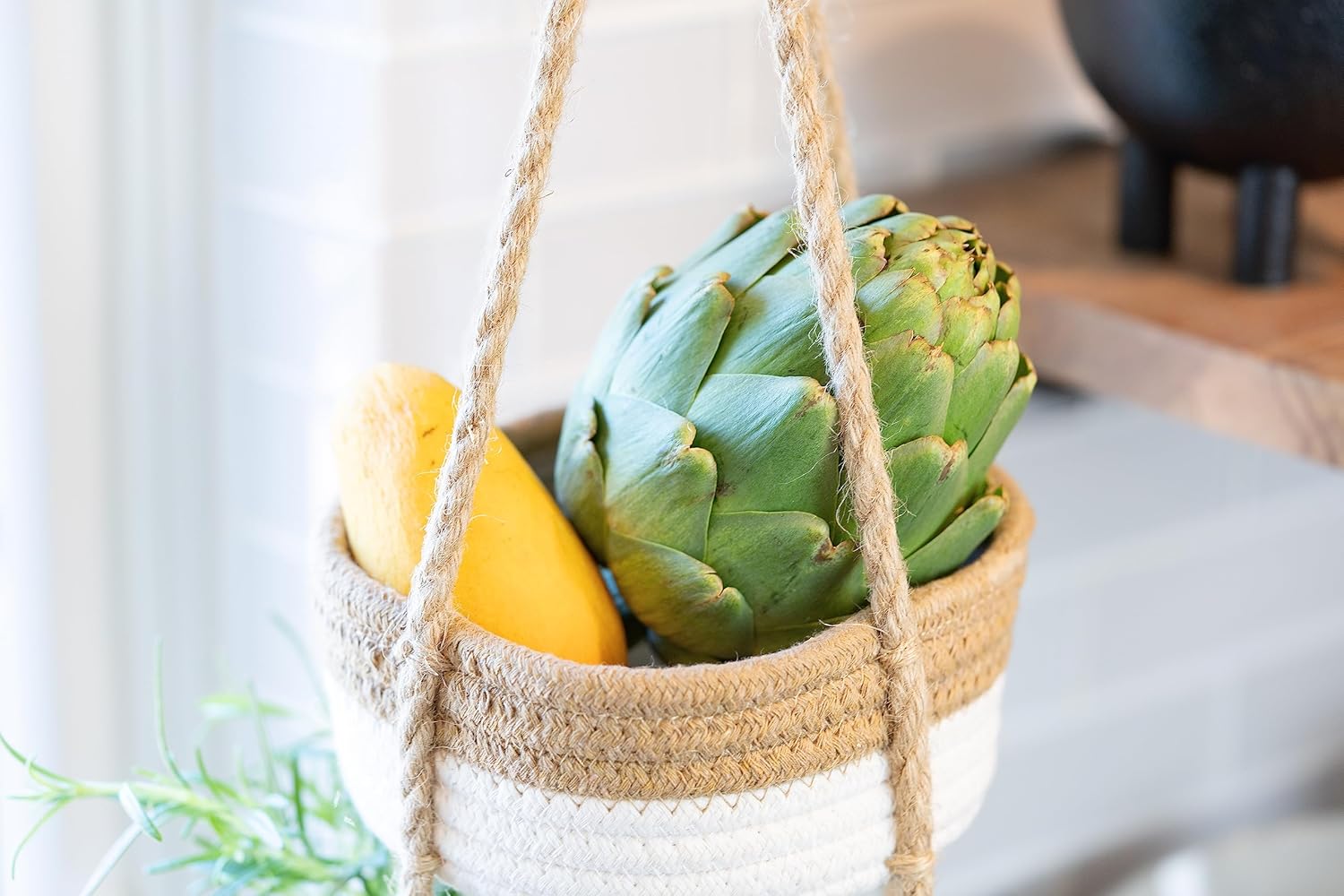 CEDAR+PINE 3-Tier Lined Hanging Fruit Basket Natural Woven Cotton with Strong Jute Rope Hanger in Gift Box Modern Hanging Basket for Kitchen