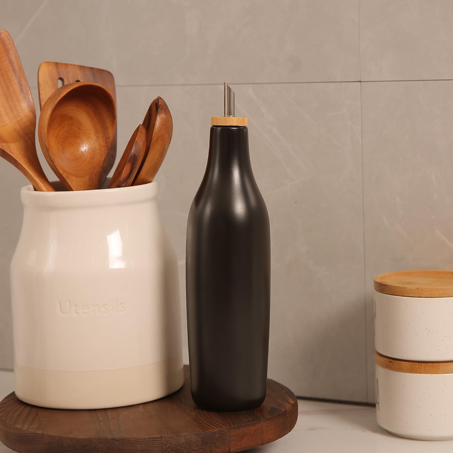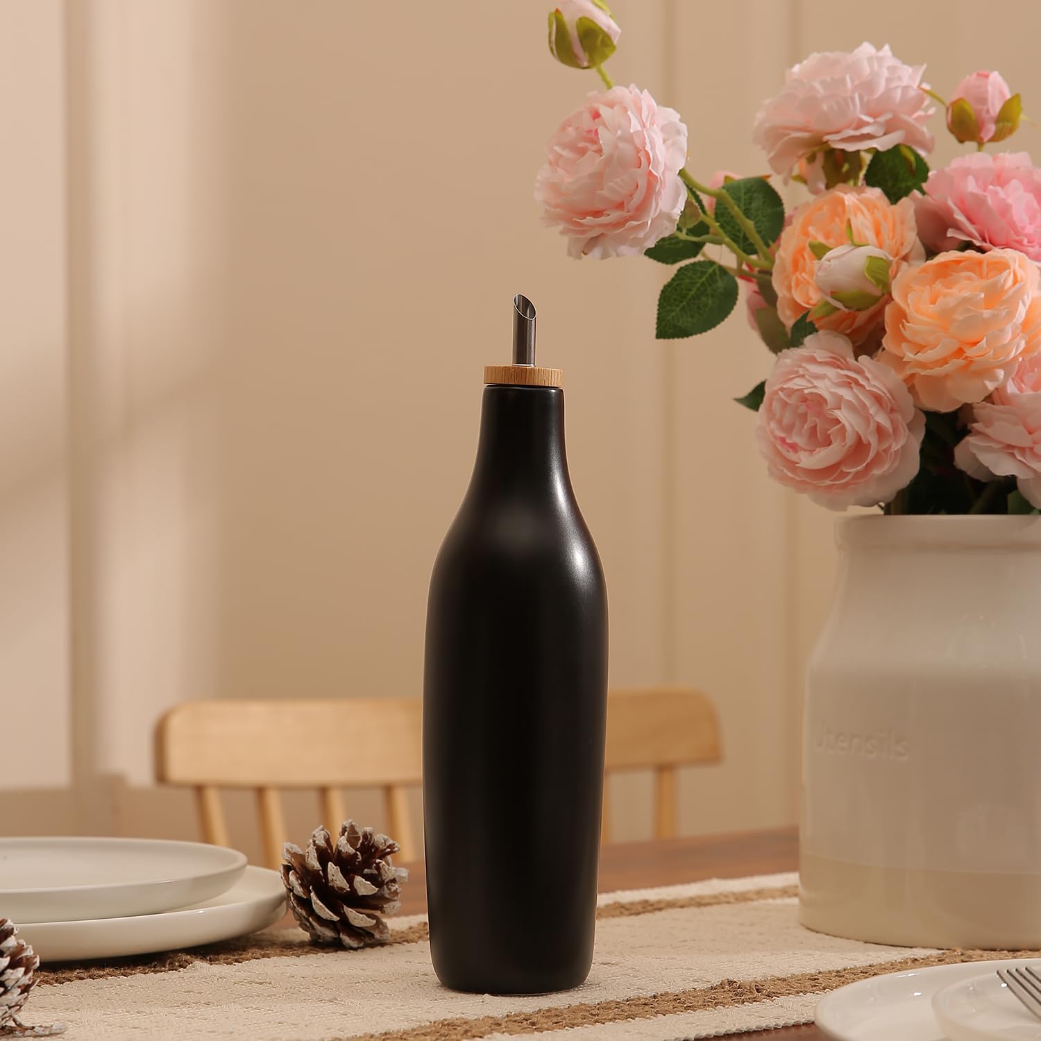 - KITCHEN BOTTLE DISPENSER - 16.9 fluid ounce (500 ml) Ceramic oil dispenser bottle or vinegar dispenser bottle with bamboo cap and stainless steel cruet spout, Works great as a kitchen dispenser for Olive Oil, Vinegar, syrups and more.