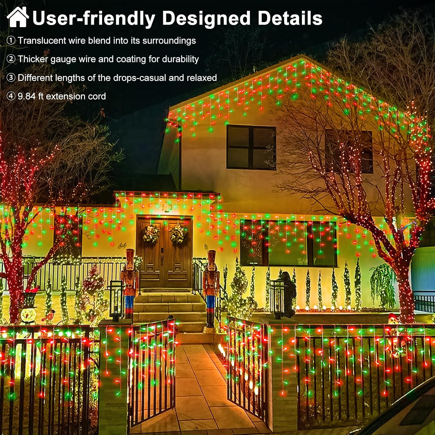 - Upgraded 8 Modes Red and Green Christmas Lights: The icicle Lights for outside have 8 selections of light pattern: 1.Combination 2.In Waves 3.Sequential 4.Slo-Glo 5.Chasing/Flash 6.Slow Fade 7.Twinkle/Flash 8.Steady On. Different lighting effects are controlled by the button on the plug. These beautiful and vibrant Christmas lights outdoor will bring you a lot of festive atmosphere.