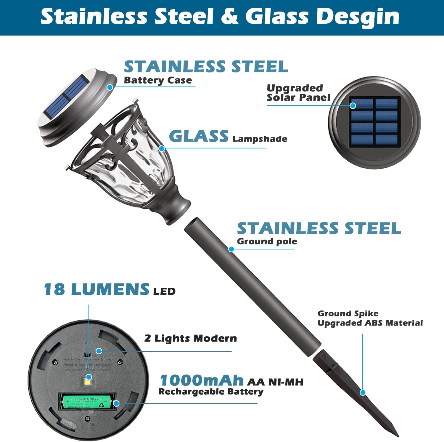 - [Stainless Steel Glass & Waterproof] LeiDrail solar lights outdoor waterproof are made of newly upgraded anti-rust and anti-corrosion coated stainless steel, which ensures a beautiful appearance and provides better sturdiness and durability, effectively extending the service life of solar lights outdoor pathway. The pathway lighst solar powered have a good waterproof system, no need to worry about rain, snow or frost.