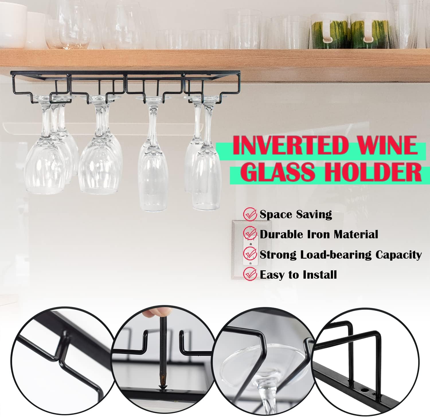- 【EASY TO INSTALL】Each glass rack with holes,comes with the mounting hardware.When you are installing this wine glass rack, you only need to use a screwdriver to screw the provided screws into the wood of the cabinet. No need to drill holes under the cabinet , it can be easily installed in a few minutes