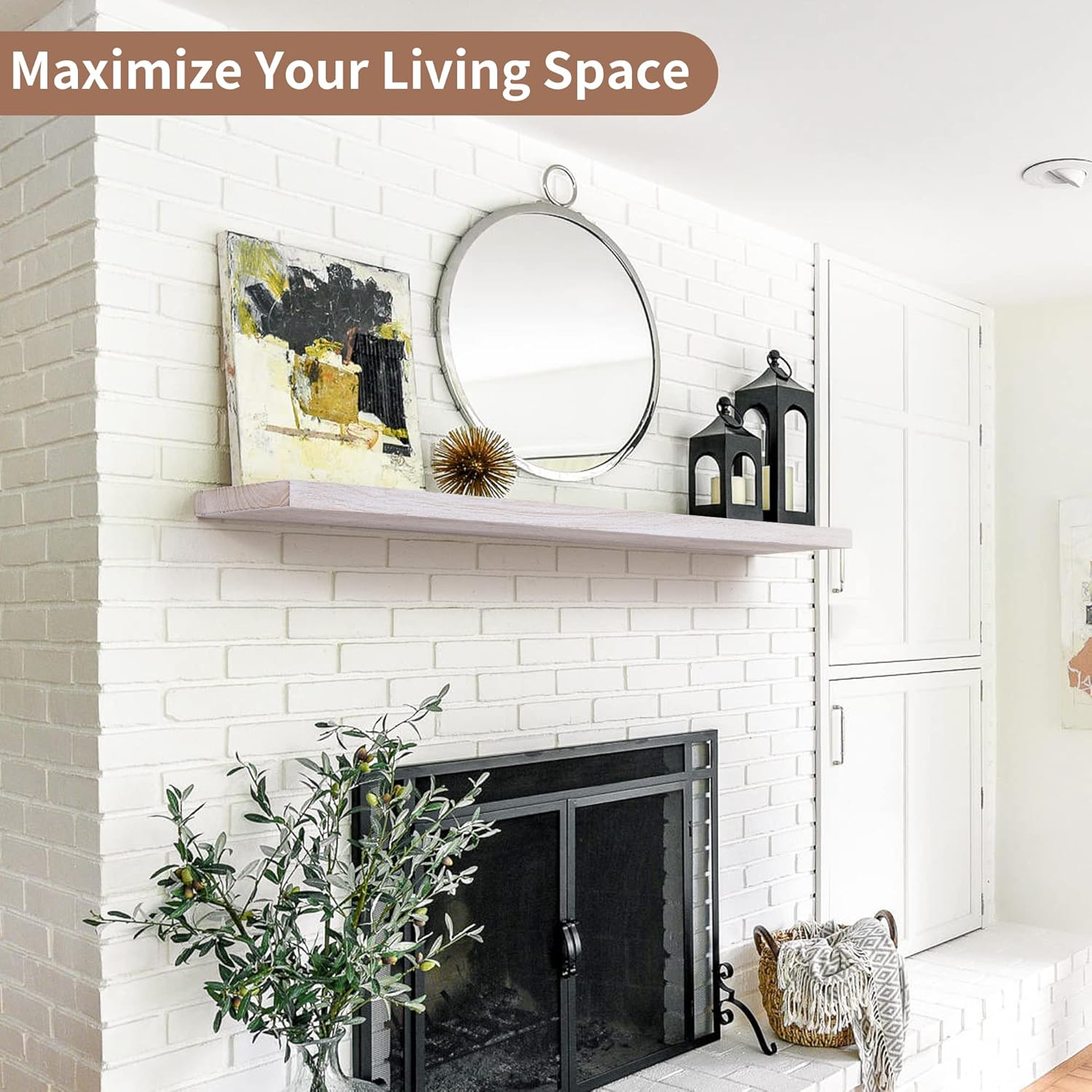 Axeman Floating Shelves for Wall, Rustic Elm Wood 48''W x 8" D Wall Shelf with Invisible Bracket, Large Long Wall Mounted Storage Shelves for Living Room, Bedroom, Kitchen, Bathroom Decor, White Wash