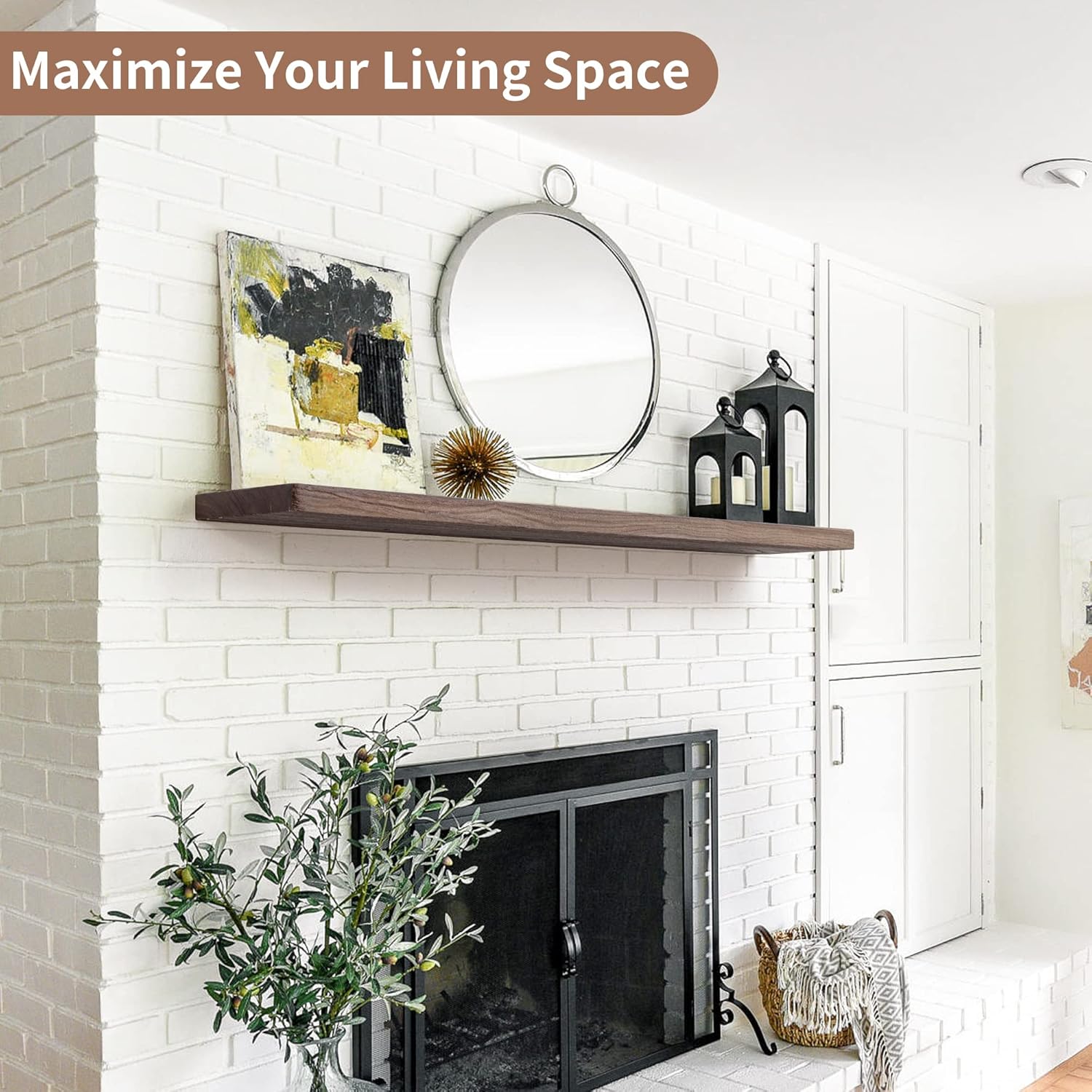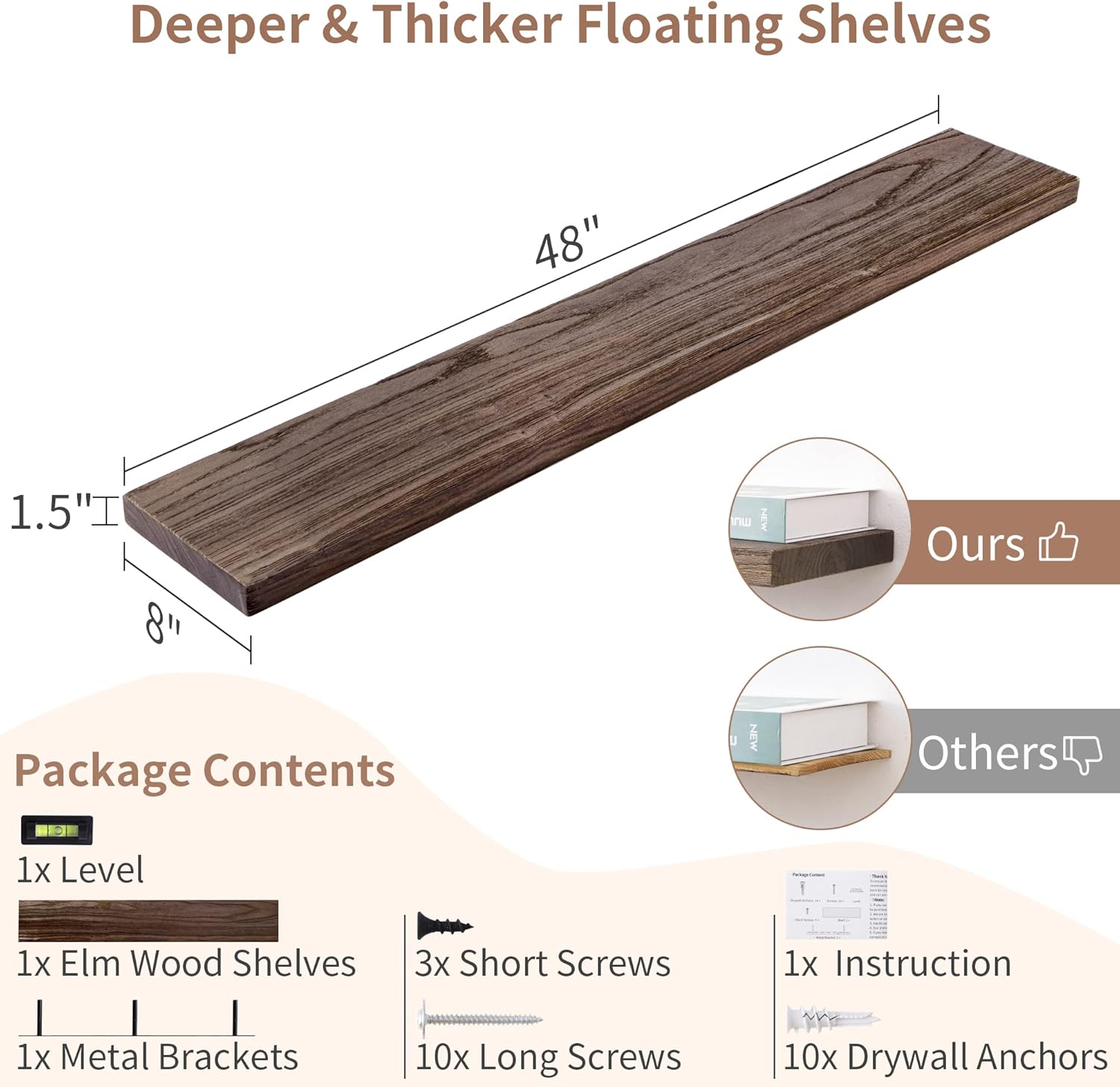 Axeman Floating Shelves for Wall, Rustic Elm Wood 48'' x 8" Deep Wall Shelf with Invisible Bracket, Large Long Wall Mounted Storage Shelves for Living Room, Bedroom, Kitchen, Bathroom Decor, Walnut