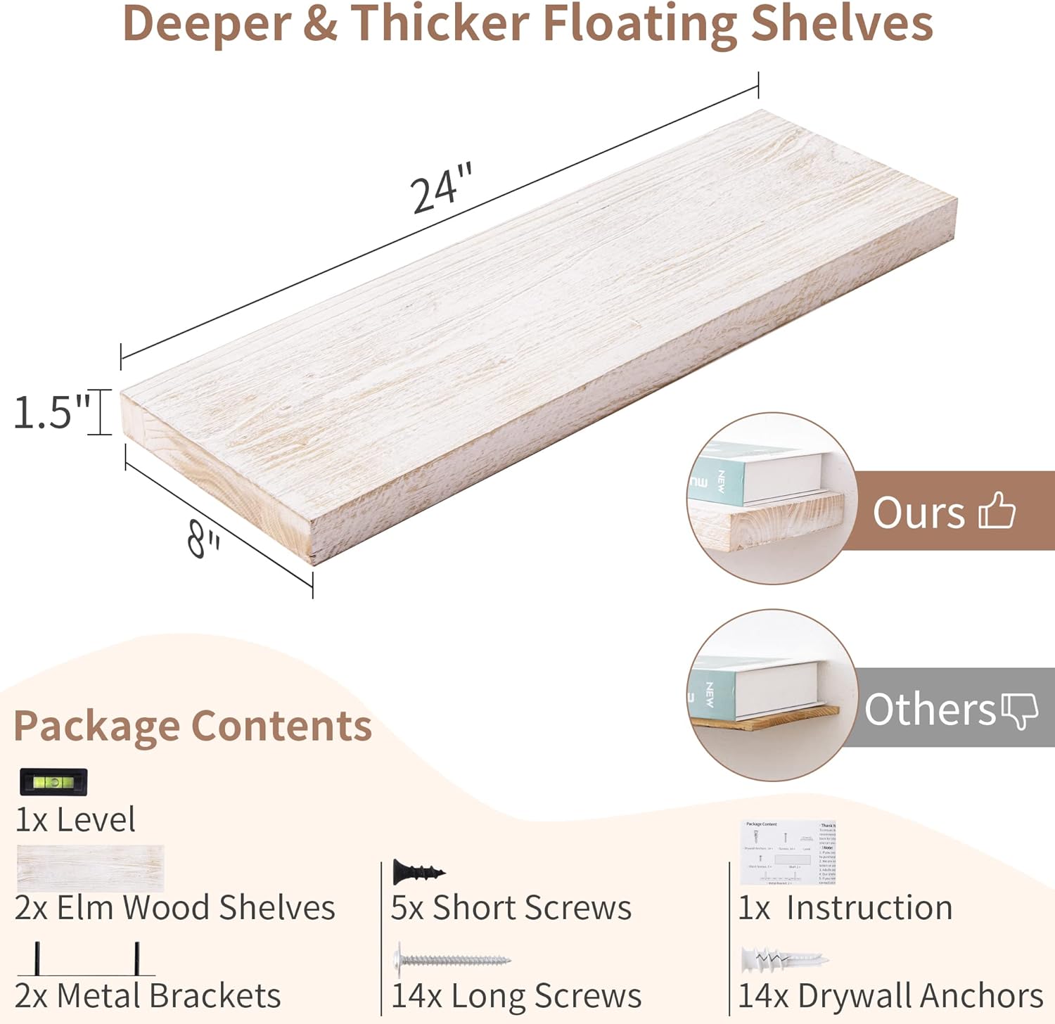 Axeman Floating Shelves for Wall, 24''W x 8''D Rustic Solid Elm Wood Wall Shelves for Storage, Wall Mounted Display Shelving with Invisible Heavy-Duty Metal Bracket (White Wash, 2PCs)