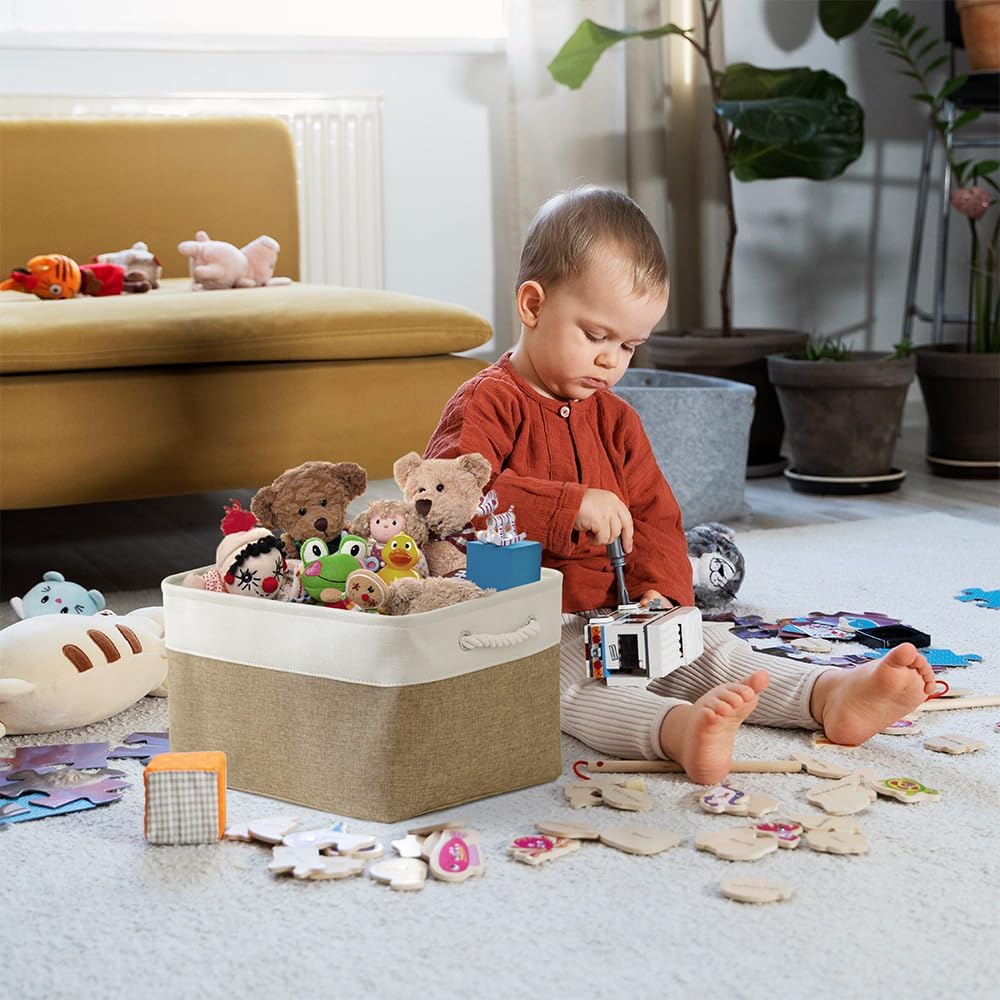 TheWarmHome Organization and Storage Basket for Organizing - X Large - 3 Pack 17.7L×13.8W×9.8H in Collapsible Storage Bin for Shelves, Fabric Basket for Gifts Organizer Toy Closet (White & Khaki)