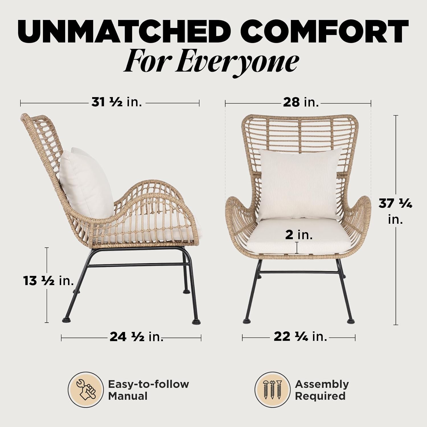 IDZO Isabelle Upgraded 2000 Hours UV Wicker Chairs Outdoor Set of 2, 500 lbs Capacity Outdoor Patio Chair, All-Weather Club Chair with Water-Resistant Olefin Cushions, Boho Style, Beige