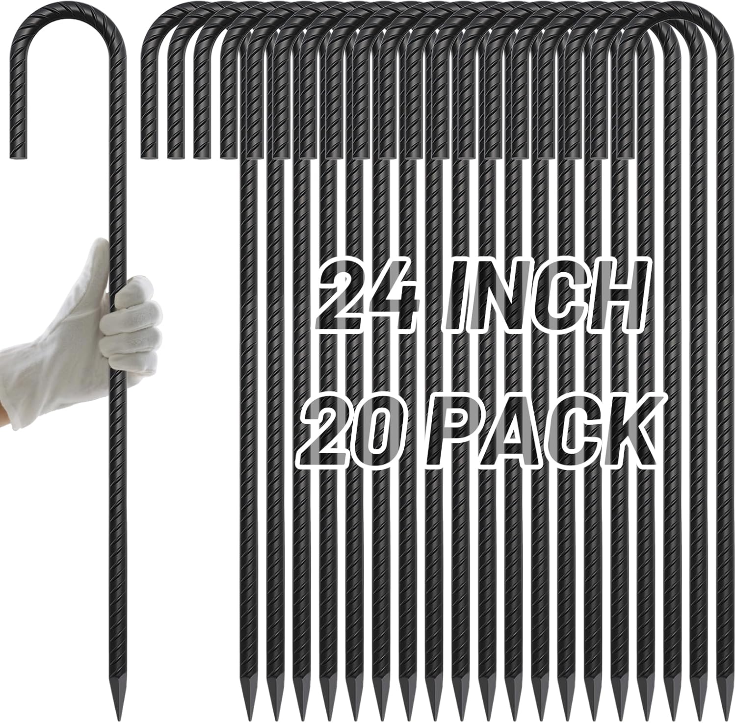 - PACKAGE INCLUDED - Set of 20 Steel rebar ground anchor stakes. Each J Hook stake is approximately 24" long; 0.47" (12mm)diameter;And hook is 5.12" (13cm) in length 2.48" (6.3cm) in diameter.The stakes has an extra-long length and a thickness that benefits, which means it can be inserted deeper and fixed more firmly.