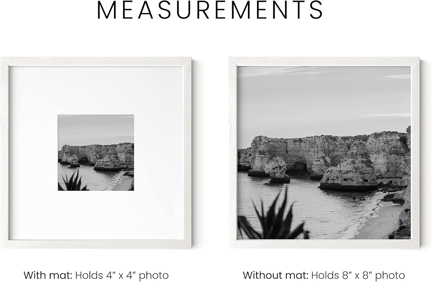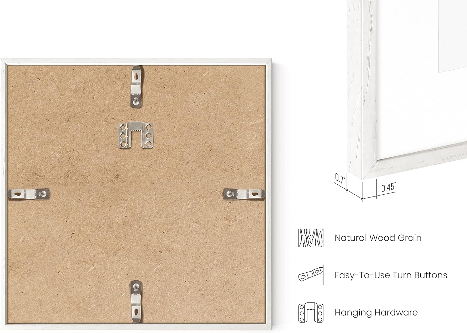 - WALL FRAMES COLLAGE SET: Our 8 x 8 picture frames white are meticulously constructed using natural oak wood, known for its timelessness and durability. The slim profile of the wood picture frames with mat effortlessly blends into any interior decor, adding a contemporary touch. The clean lines and sleek design make the photo gallery wall frame set a perfect choice for those seeking a stylish, understated display solution