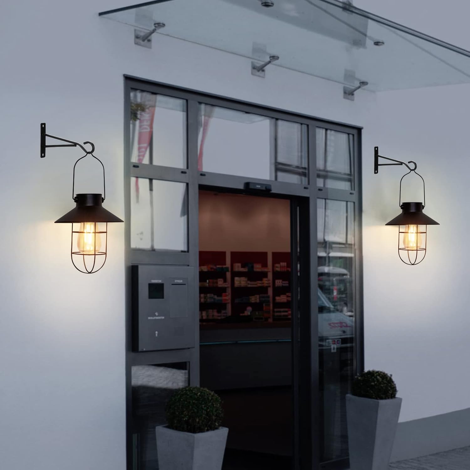 pearlstar Solar Lanterns Outdoor Metal Solar Powered Hanging Lights Waterproof for Wall Barn Yard Garden Patio Garage Balcony Porch Fence Decor, Warm White Edison Bulb (Black-2pack)