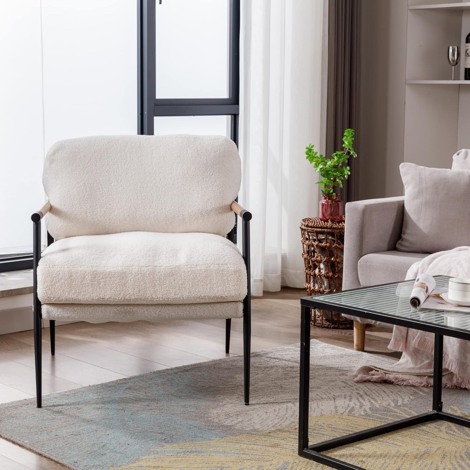 Mid-Century Accent Chair Set of 2, Soft Armchair Sherpa Fabric Lounge Chair with Black Metal Legs, Upholstered Leisure Chair for Living Room Bedroom Reception Room, White