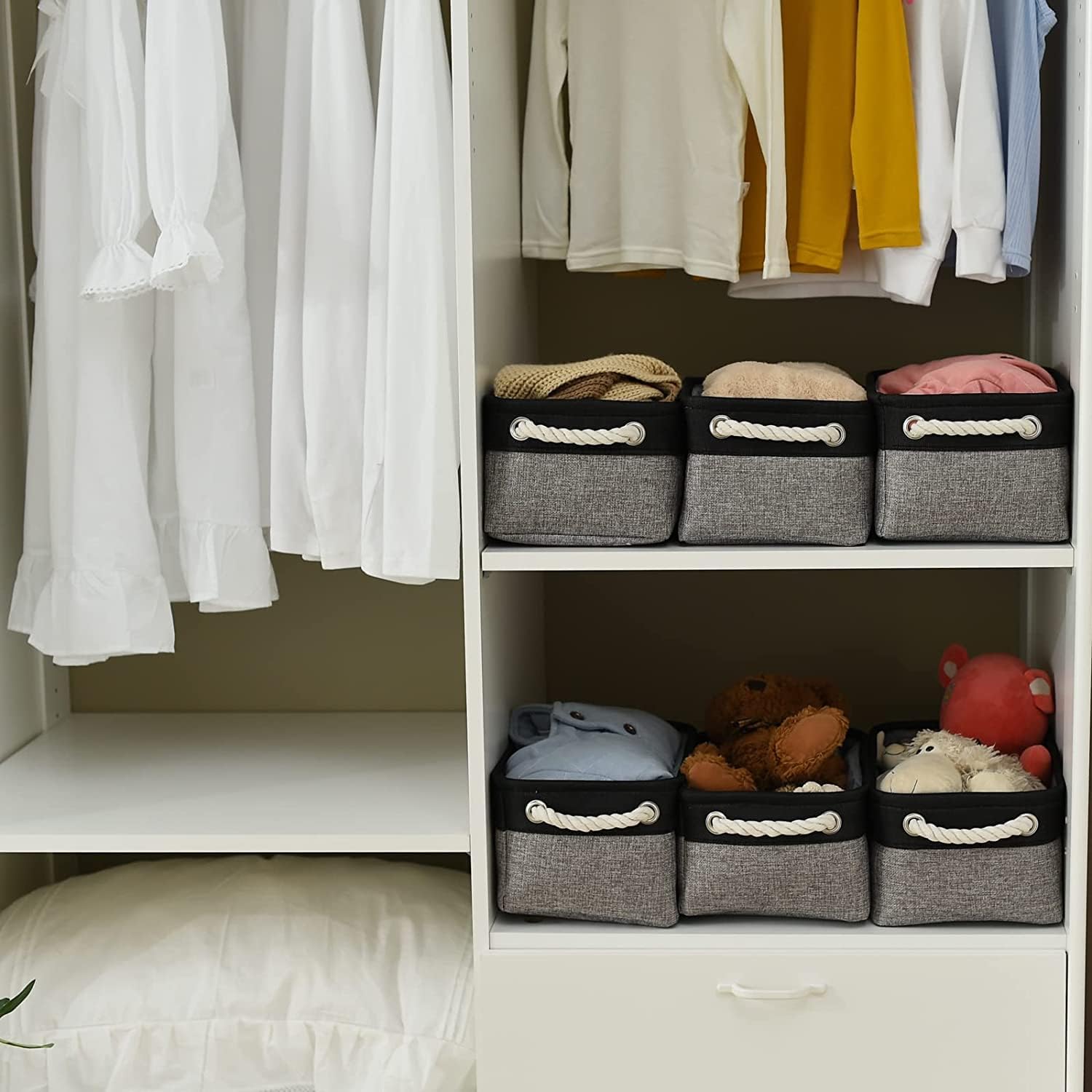 TheWarmHome Storage Basket for Organizing - 12x8x5.2 inch Small 6 Pack Collapsible Storage Bin for Shelves with Rope, Fabric Storage Cubes for Cloth Gift Toy Decorative Organizer (Black & Grey)