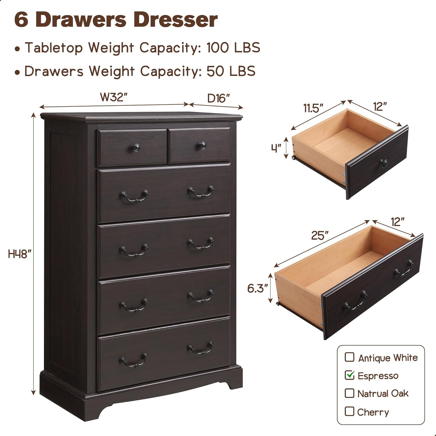 - 【Dimension】32''W x 16'' D x 48'' H.With 4 25-inch Width darwers (size: 26.5''W*12D*6.3H) and 2 11.5-inch Width darwers (size: 11.5''W*12D*4H. Add storage space into your home for your clothing and extra throws or pillows with this 6 drawer dresser.What a charming dresser complements for any vintage inspired enthusiast.