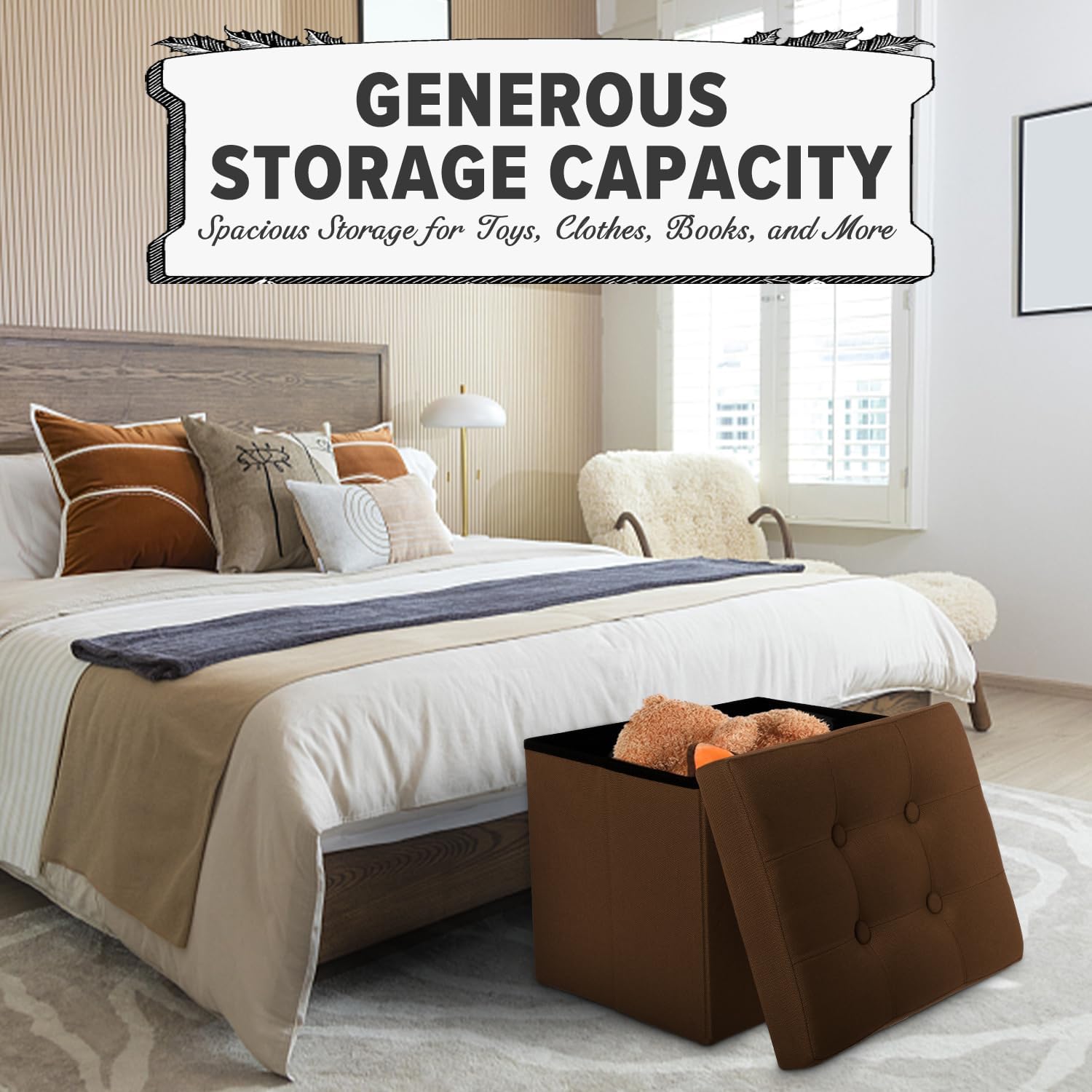 - 【Magical Space】 17 * 13 * 13-inch multifunctional storage stool, cleverly crafted, effortlessly slims down to 17“L x 13” W x 2.5“H – it's like a folding magic space! Maximize the liberation of your space, effortlessly blend into compact living spaces, and flexibly arrange various occasions, injecting more convenience and aesthetic appeal into your personalized space