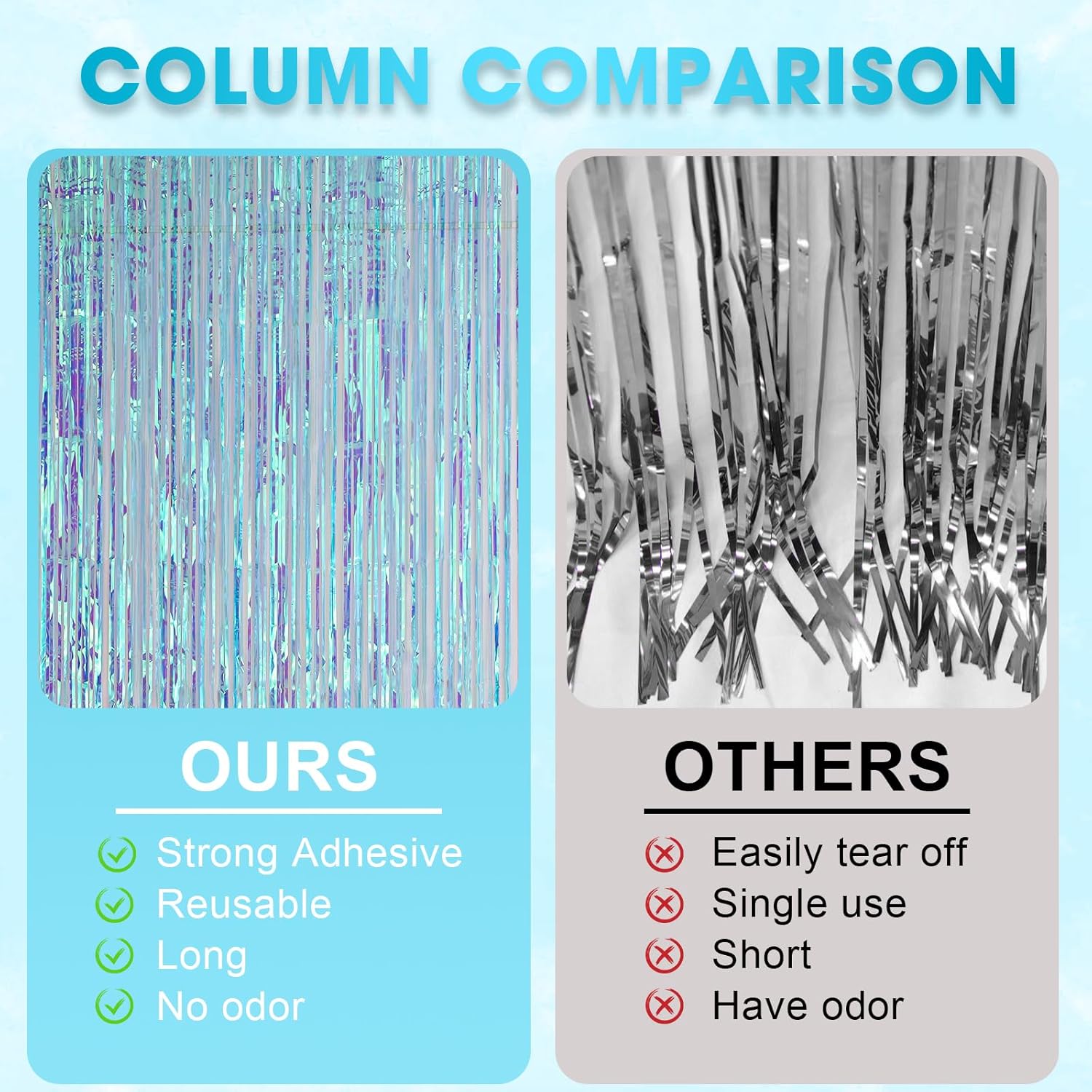 - Package Included: 3 packs of foil fringe curtains, the size of the foil curtain is 3.3*8.2 ft. It's long enough to fit any occasion. Please do not stick the foil curtain on uneven or stained walls to prevent it from falling off