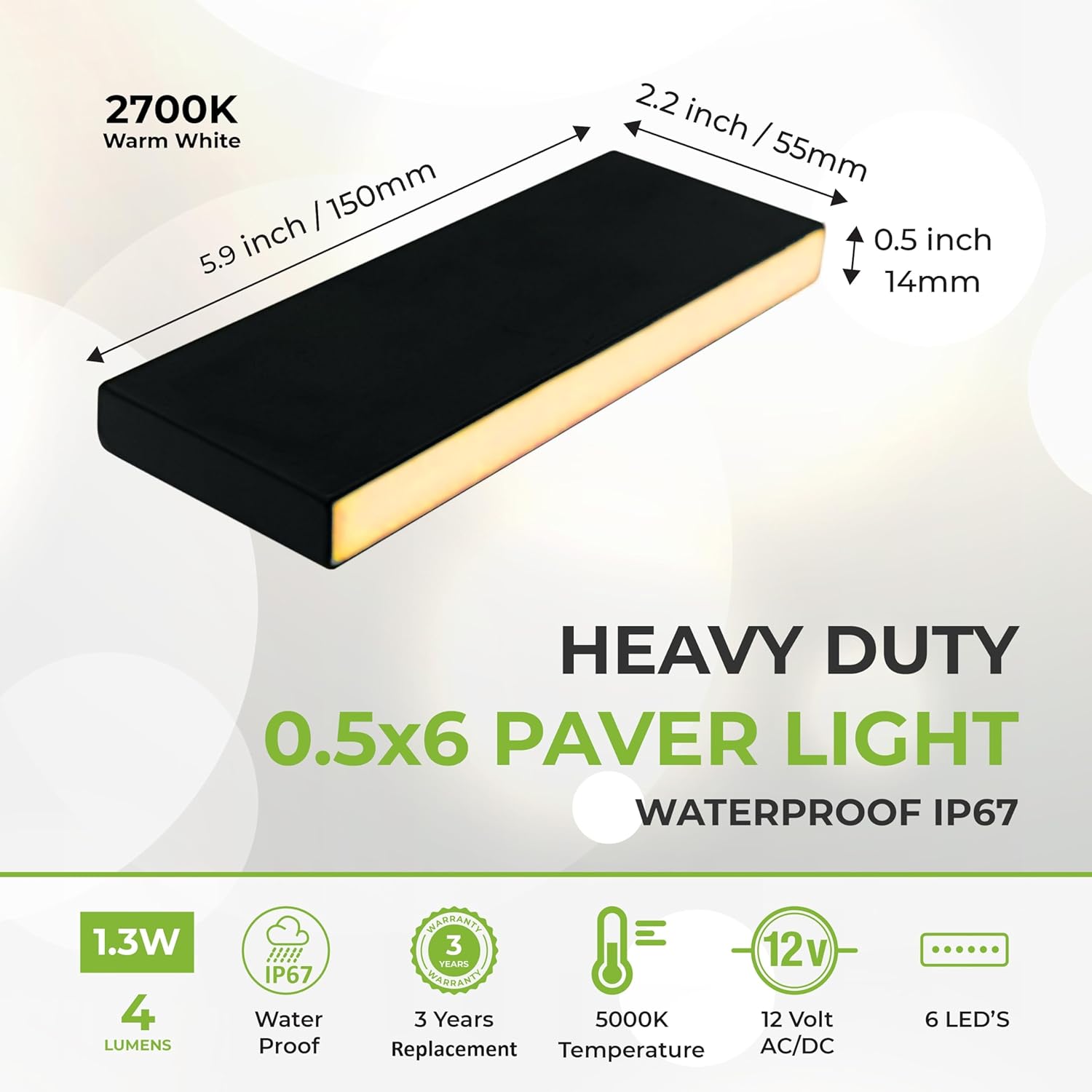 LUMENGY Paver Light Slim 0.5x6 Inch Glare-Free Steel Brick Lighting for Pavers, Walls, Driveway & Pathway Borders 2700K Warm White, Waterproof, Drive-Over Rated - 12V AC/DC