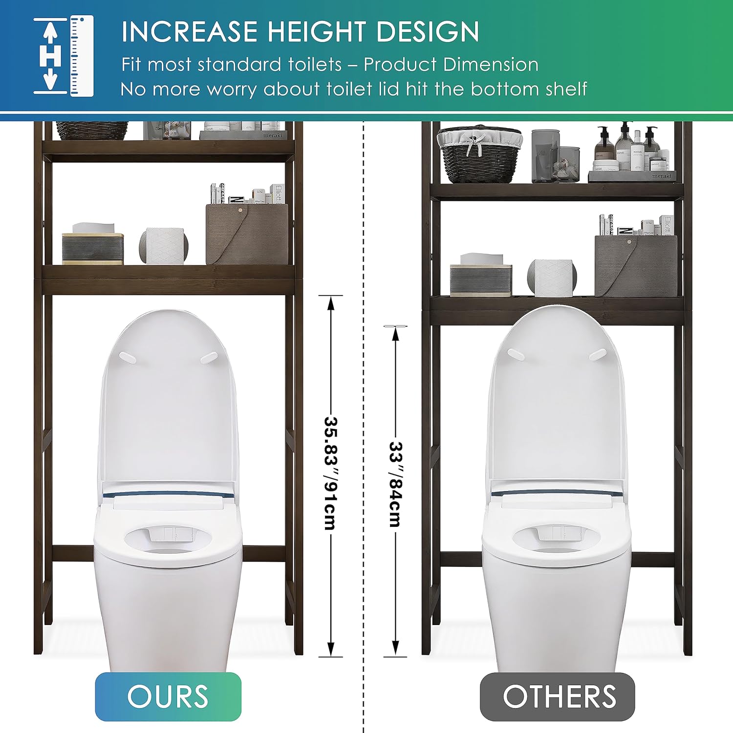 - DOβT WASTE SPACE ABOVE the TOILETοΌ Designed to make full use of the blank space above the toilet, this space-saving toilet storage rack give you 3 adjustable shelves to hold all your bathroom essentials. Besides, placed it above the washing machine to store care supplies also would be a good idea