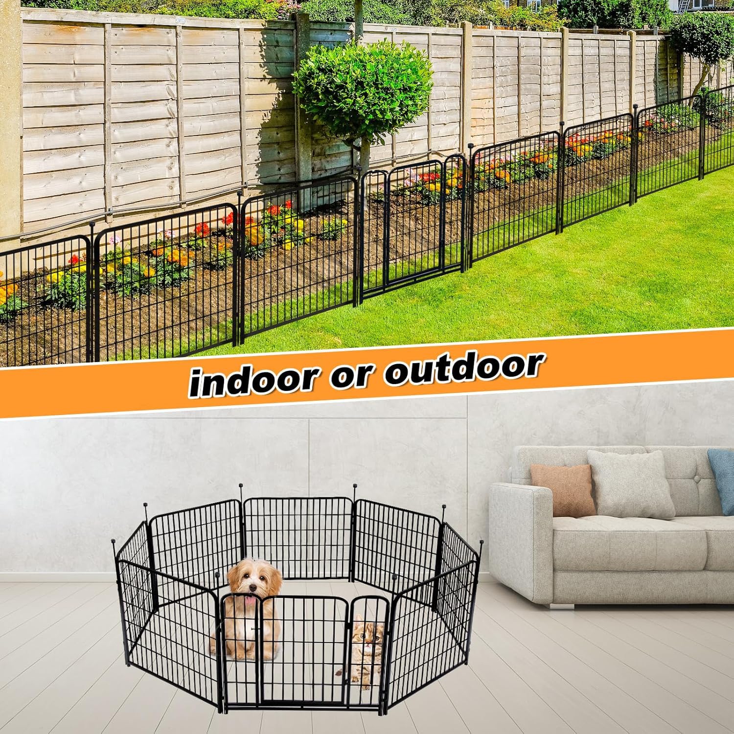 - Wide Application: This Metal Fence is Great for Gardens, Lawns, Vegetable Garden Borders, and Path Edge Fences. It Can also be Used Indoors as Your Pet's Fence. The Bottom of the Pole is Equipped with an Anti-friction Sleeve That Won't Scratch Your Floors. It Can also Work as an Outdoor Pet Fence When You're Traveling or Camping