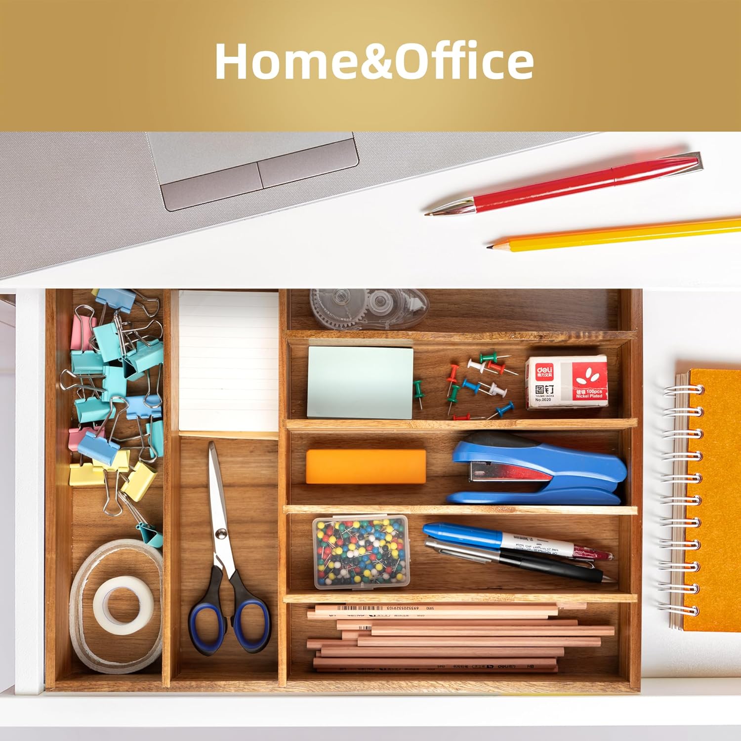 - γKeep Your Home TidyγThis beautiful 7-compartments cutlery organizer has 2" deep compartments and can be placed into any drawer or desktop, which helps you to see everything at a glance and keep away from messy. The perfect space-saving acacia wood silverware organizer helps you to reach the desired item that you are looking for. Whether you are looking for your favorite knife or spoon, this utensil organizer makes it completely simple. We highly recommend to measure your drawer before order.