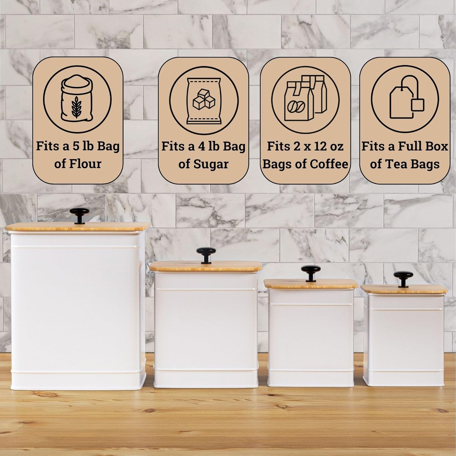 - DECORATIVE & FUNCTIONAL - Designed for display with a sleek matte white powder coated finish and contrasting bamboo lids, these decorative kitchen jars match any decor from farmhouse to modern. Made of iron, these white kitchen accessories are light and not breakable, but sturdy and designed to last, as well as being easy to hand wash.